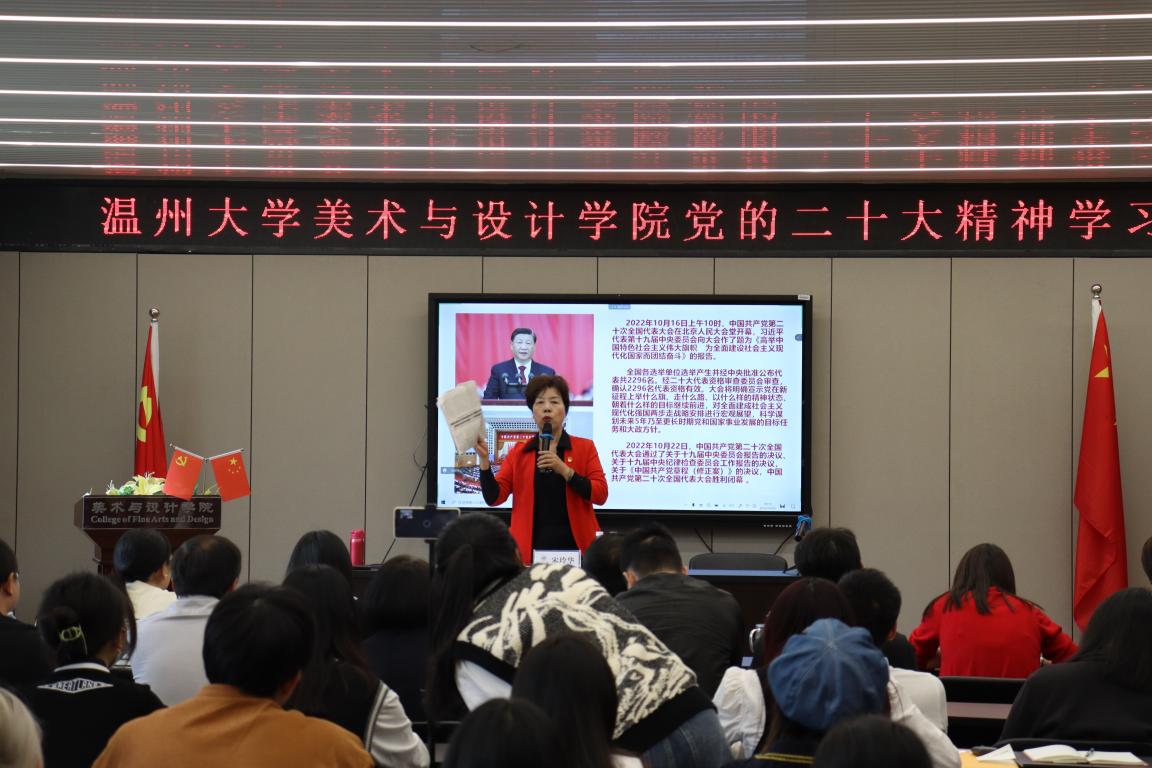 为深入学习宣传贯彻党的二十大精神,感悟思想伟力,汲取奋进力量,引导全院师生切实把思想和行动统一到党的二十大精神上来,10月26日下午,MILE米乐集团组织开展党的二十大精神学习会,特邀党的十九大代表宋玲华同志为学院全体师生作“学习感悟党的二十大精神”专题宣讲报告。会议由学院党委书记叶正飞主持,近500名师生线上线下参加学习活动。宋玲华老师是党的十九大代表,市妇联执委,瓯海区关工委主任,瓯海区慈善总会副会长,瓯海乡村艺术团联合会主席,宋玲华党代表工作室负责人,浙江省关心下一代报告团成员,温州银耀瓯越宣讲员,温州老干部大学流动红色能源站讲师,宋玲华宣讲工作室负责人。学习会上,宋老师从一名党代表的视角、一名退休党员的视角、一名公益先锋的视角,全面分析讲解党的二十大报告内容,分享了党的二十大精神的内涵理解和学习体会。她指出党的二十大是在全党全国各族人民迈上全面建设社会主义现代化国家新征程、向第二个百年奋斗目标进军的关键时刻召开的一次十分重要的大会,是一次高举旗帜、凝聚力量、团结奋进的大会,在党和国家发展进程中具有极其重大的历史意义。党的二十大报告,为党和国家事业描绘了清晰的发展路线,擘画了宏伟的发展蓝图,充分彰显了我们党坚如磐石的历史自信、举旗定向的政治担当和高瞻远瞩的战略视野,是我们党团结带领全国各族人民在新时代新征程坚持和发展中国特色社会主义的政治宣言和行动纲领。“我要把党的‘好声音’传递到基层群众,传递给青年学生,这是我的职责和使命。”宋玲华老师在宣讲过程中也分享了多年来践行一名共产党员初心使命的经历,从丰富地方群众的文化生活到宣讲低碳环保的生活方式,从省吃俭用捐助困难群众到关爱帮扶失足少年,从退休党员干部到十九大党代表……,希望通过自己的付出和行动,带动更多人做对社会有益的事。学习会上,宋玲华老师用习近平总书记的话“青年强,则国家强!”来勉励师生党员,要坚定不移听党话、跟党走,怀抱梦想又脚踏实地,敢想敢为又善作善成,立志做有理想、敢担当、能吃苦、肯奋斗的新时代好青年,让青春在全面建设社会主义现代化国家的火热实践中绽放绚丽之花。叶正飞书记总结指出,学习好宣传好贯彻好党的二十大精神是当前和今后一个时期学院的首要政治任务。新时代新征程,全院师生要深学细悟党的二十大精神,要把坚决拥护“两个确立”转化为坚决做到“两个维护”的实际行动,要聚焦“争当表率、争做示范、走在前列”光荣使命,奋力推动学院高质量内涵式发展,为全面建设社会主义现代化国家、全面推进中华民族伟大复兴作出更大贡献!