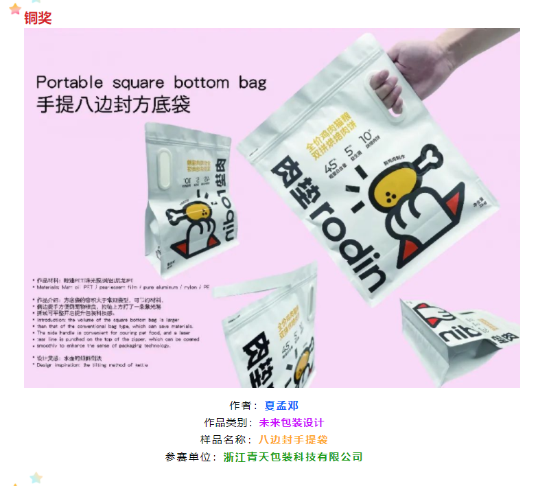 浙江青天包装科技有限公司生产的八边封手提式平底包装袋也是去年赛事的铜奖获奖作品之一。该款产品在设计中参照了水壶的倾斜倒法,将常见的平底包装袋改为手提式,大大提高了使用者的便利度。据设计者夏孟邓介绍,今年该产品已为其公司增加产值超100万元。“无论是创意设计、外观设计还是产品结构设计,归根结底都是为产品赋能的,我们这款设计作品,其实只是在传统包装设计里做了一个小改动,但是获奖的原因恰恰是在于这小改动背后‘以人为本’的设计理念。”夏孟邓表示。