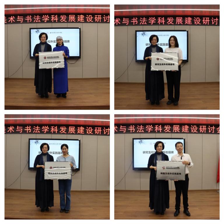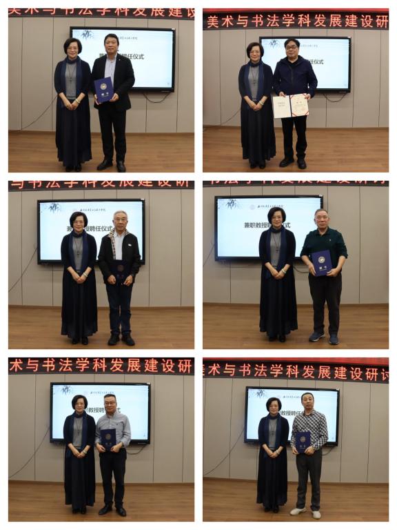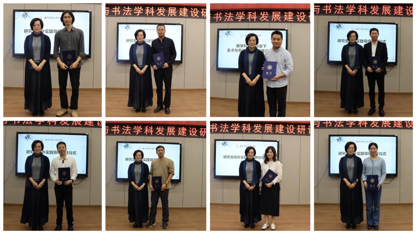随后,学院聘任浙江省美术家协会副主席、温州市美术家协会主席张成毕,温州市书法家协会主席吴聘真,浙江省文史研究馆馆员、温州市书法家协会顾问汪廷汉,温州市美术家协会顾问、原温州市美协副主席、秘书长孙光奇,温州美术馆副馆长、温州市美术家协会副主席张正凯,温州市美术家协会顾问、原温州市美协副主席叶旭华为学院兼职教授;温州市美术教研员李崇高,温州市马鞍池小学校长林大康,浙江省特级教师邹黎明,瓯海区美术教研员黄德靖,温州市龙湾区职业技术学校副校长潘世培,温州博物馆副研究员方长山,温州市美术馆展览策划部主任林翼如,温州市文化馆艺术视觉中心美术干部金婧婧为研究生校外实践导师;授予温州第十九中学、温州市第十二中学、温州市文化馆、温州市龙湾区职业技术学校“研究生校外实践基地”。谢子静院长为学院兼职教授、研究生实践导师颁发聘书,并为研究生校外实践基地授牌。