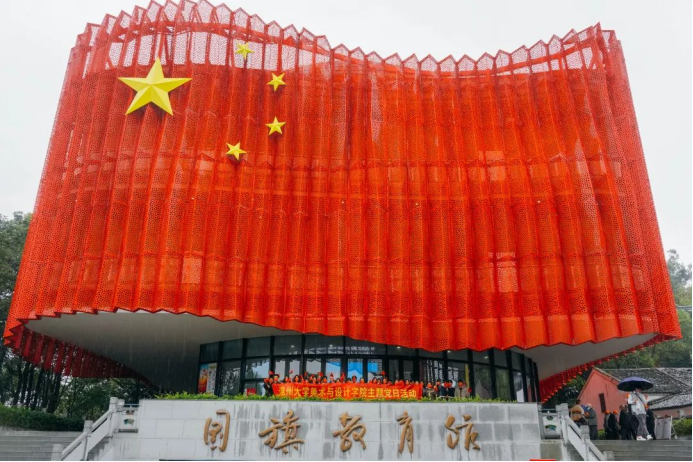 为深入贯彻习近平新时代中国特色社会主义思想,认真贯彻落实党的二十大精神,2022年11月2日下午,MILE米乐集团学生党员来到了全国首家综合性国旗教育馆——瑞安国旗教育馆,开展“赓续红色血脉 奋进时代征程”主题党日活动。党员们在五星红旗前行注目礼,在巨幅屏幕前体验了一次特殊的升旗仪式,在慷慨激昂的国歌声中齐声合唱,在校友曾联松先生的雕像前追忆国旗的设计历史……凝视着鲜艳的五星红旗,更加坚定了党员们奋进的步伐。 瑞安国旗教育馆位于西山之巅,总建筑面积2600多平方米,其中布展面积近2000平方米。展馆共有4层,以“天圆地方、天瑞地安,鼎盛中华、红旗飘扬”为设计主题。 忆往昔峥嵘岁月,筚路蓝缕、栉风沐雨,不变的是鲜红的旗帜,不变的是华夏儿女赤诚的初心。移步至国旗诞生厅内,讲解员向大家讲述了设计者曾联松从缘起到邂逅、与五星红旗之间的故事。通过五星红旗诞生的故事,党员重温了国旗的设计理念。了解国旗的制作、国旗的涵义、国旗的标准等内容,感受“一旗、一人、一馆、一城”的情缘。 五星红旗在设计上非常讲究,整体布局中偏庄严庄重。该旗采用非对称的设计,旗面左上方缀五颗黄色五角星。一星较大,其外接圆直径为旗高十分之三,居左;四星较小,其外接圆直径为旗高十分之一,环拱于大星之右。利用向心角度变化每一个角都能指向大的五角星,星布成椭圆形,大星导引于前,小星环绕于后,恰似众星拱北斗的红地五星旗,同时以大小之势,呈现出了这组图案的张力与立体感,并在视觉感官上给人以协调和平衡。同时五星红旗又叫红地五星旗,红色代表革命,五颗红星象征着中国革命人民的大团结,是中华人民共和国的象征和标志。它见证着牺牲与奉献,代表着神圣与崇高,寄托着热爱与自豪。 浩渺行无极,扬帆但信风。学生党员们在党旗前重温入党誓词,在馆内外唱响《我爱你,中国》,表达青年学生党员的爱国情、强国志、报国行。 本次主题党日活动,以国旗为主线引导党员深入了解红色政权来之不易、新中国来之不易、中国特色社会主义来之不易,回顾中国共产党带领祖国崛起的历史性时刻。作为新时代的美院学子,曾联松先生让后辈感受到了青年匠人需要的担当和使命。激励青年党员将不断提高专业技能,加强党史学习,提升党性修养,不忘初心,砥砺前行,不负新时代,做好答卷人。