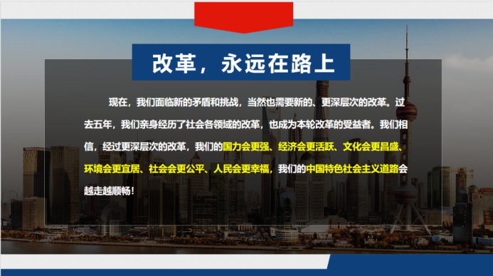 当今社会,我们面临着新的挑战和机遇,此时全面深化改革显得尤为关键。改革就是更好地服务于广大群众,改革就是为人民而改。我相信,通过全面深化改革,我们祖国的实力会更加雄厚,社会会更加安定,人民会更加幸福。作为一名新时代的大学生,我们要延续红色基因,传承改革精神,积极关注国家政策,响应国家号召,在学校、社会中发挥自己的力量,以高度的责任和强烈的历史使命感投入到改革中去,坚守初心,砥砺前行,谱写新时代的美丽篇章。