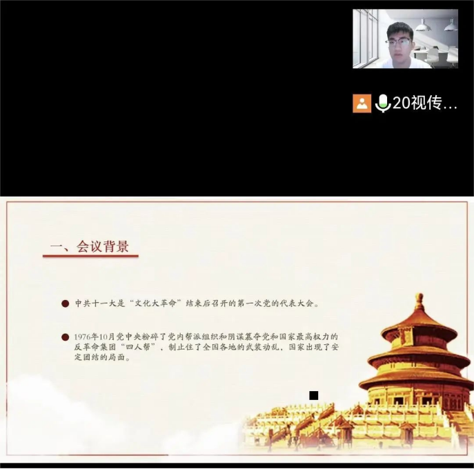 “以史为鉴是为了更好的前进”,本次微党课着重学习了中共十一届三中全会相关内容。由于领导人对当时党和国家政治状况的错误估计,“文化大革命”已然酿成一段惨痛的历史。在结束文革后,十一届三中全会的召开披戴希望和觉醒的曙光,将“实践是检验真理的唯一标准”作为今后砥砺前行的标杆之一,从根本上冲破长期“左”倾思想的严重束缚,端正党的指导思想,实现思想路线、政治路线和组织路线上的拨乱反正,并以此为全新起点,开拓进取、实干兴邦,在挫折中成长,在探索中前进,在建设中国特色社会主义道路的实践中开创党的事业新局面。历史有如明镜,我们应当学会“曲折前进、螺旋上升”是万物常态,凡事要踏实肯干,不可急功近利,方能在行进途中瞥见万点星光。