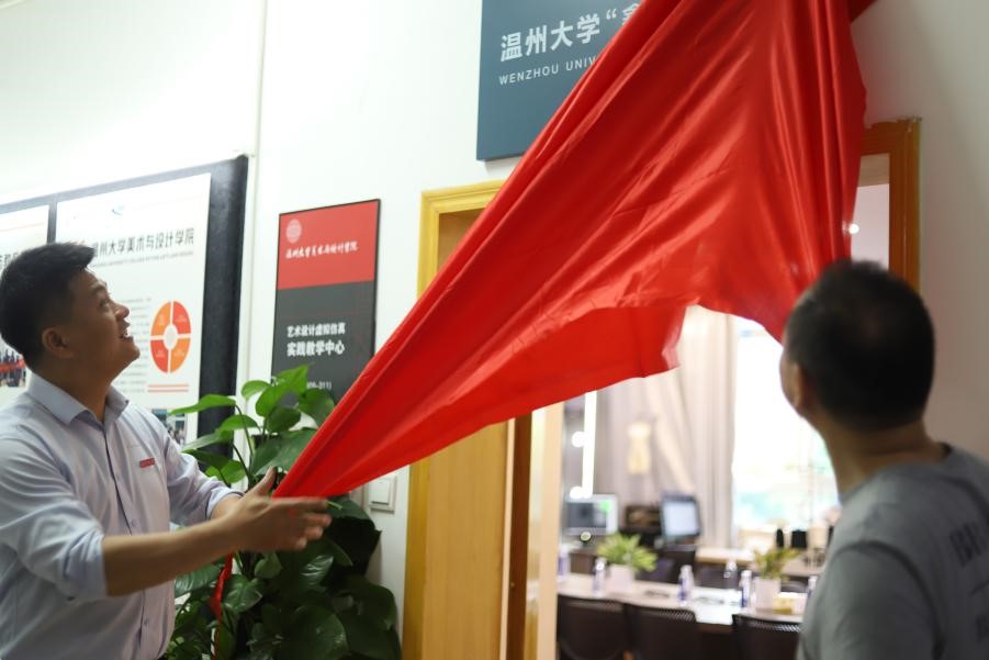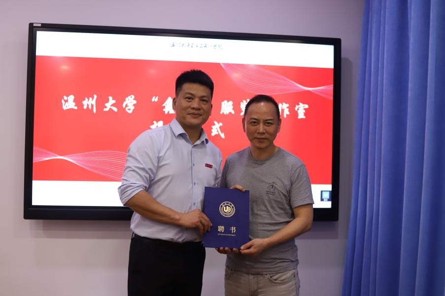 刘军董事长和叶正飞书记共同为MILE米乐集团“鑫诺”服装工作室揭牌,叶正飞书记为刘军颁发创新创业导师聘书。