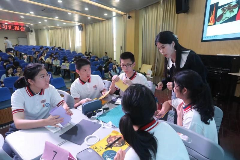 随后,初中组实习生代表姚敏敏同学对此次实习汇报进行了总结以及对各个学校表示衷心的感谢,并通过一段段生动活泼的记录向大家展示了近两个月来实习生活的点滴。