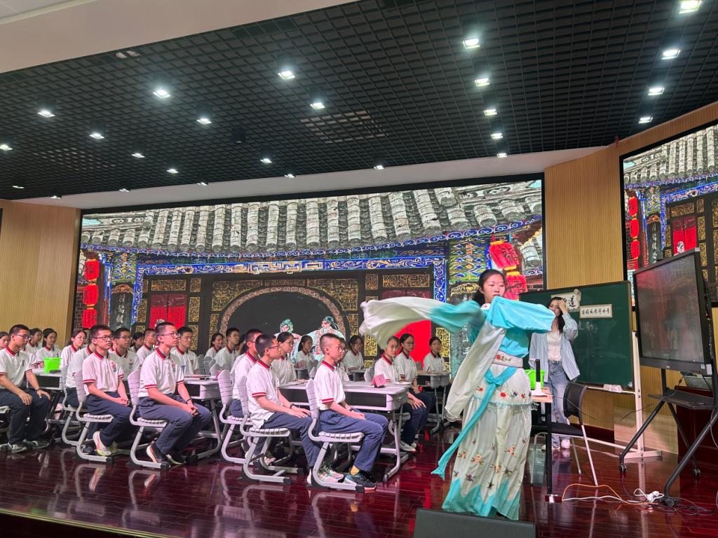 第一节展示课是由温州第二实验中学实习生代表叶佳慧带来的自编课程《水之道》-梨园风骨寄丹青。课堂以水袖舞作为导入,整堂课的氛围充满中华古典韵味,将水袖与国画水墨纹理相结合,将水拓作品与戏曲人物进行联想创作,让大家眼前一亮。
