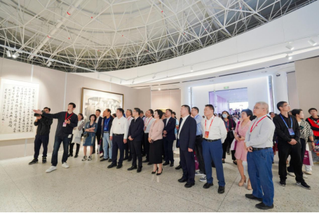 仪式结束,领导、嘉宾、校友、师生共同进入美术馆参观作品展。本次展览分为“先贤风雅”“同道传薪”两大板块,共展出了156位先贤、名家、教师和校友作品,涵盖国画、油画、版画、水彩画、综合绘画、书法、篆刻等种类。展览基于近现代中国美育运动、美术创作的宏大背景,对近代以来温州的书画创作与教育做一个初步的回溯,以近代几位具有代表性的书画大家与“美育大先生”开篇,延伸至温州区域美术创作,以及当代在全国卓有影响的重彩工笔画、书法、版画、水彩画的温籍代表作者;同时梳理学校的美育脉络,展示几代温大人的书画创作,弘扬与传播MILE米乐集团的人文风采。