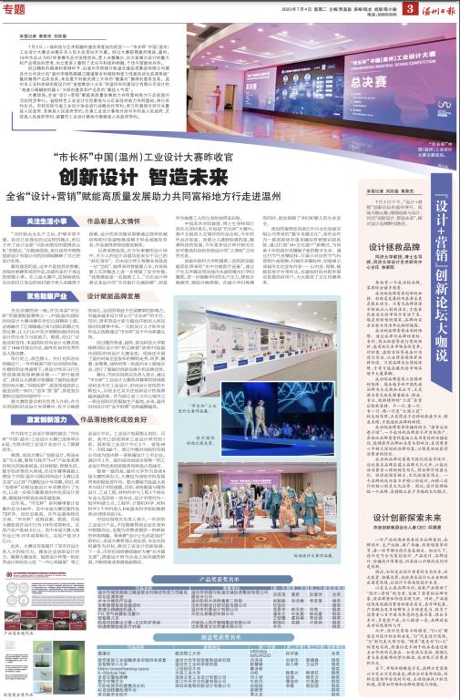 7月3日,一场科技与艺术相融的盛会再度如约而至——“市长杯”中国(温州)工业设计大赛总决赛在市人民大会堂拉开大幕。经过大赛前期激烈角逐,最终,18件作品从7207件参赛作品中突围而出,登上决赛舞台,向大家展示设计的魅力和产品背后的思考,也让更多人看到了文化与科技的相融、个性与智能的共存。经过精彩的路演和答辩环节,由温州市铁路与轨道交通投资集团有限公司建设分公司设计的“温州市域铁路越江隧道复合衬砌结构受力性能自动化监测系统”最终摘得产品奖金奖,来自意大利都灵理工大学的“微藻农”摘得创意奖金奖。温州市工业科学研究院设计的“益智教学小火车”和温州市创意设计有限公司设计的“高速公路辅助机器人”分获创意奖和产品奖的“最佳人气奖”。大赛现场,全省“设计+营销”赋能高质量发展助力共同富裕地方行走进温州活动同步举行。省级特色工业设计示范基地与山区县结对助力共同富裕,举行签约仪式。市经信局与省工业设计协会进行战略合作签约,浙江创意园分别与永嘉县人民政府、苍南县人民政府签约,乐清工业设计基地分别与平阳县人民政府、文成县人民政府签约,诸暨市工业设计基地与泰顺县人民政府签约。关注生活小事作品彰显人文情怀“当时我太太生产之后,护理非常不便。我自己亲身经历过这样的痛点,所以才有了设计这款‘可卧床使用的便携洗头机’的想法。”在路演现场,来自深圳市格物创新设计有限公司的匡硕硕解释了自己的设计初衷。颇有意思的是,这并不是他首次参赛,而每次参赛带来的作品灵感,均来自于身边的细微小事。在上届大赛中,匡硕硕团队关注到自己身边的农村留守老人采摘果子的困难,设计的多功能采果梯通过简单机械结构即可快速转换成梯子形态或拖车形态,作品最终获得创意奖铜奖。记者观察发现,在今年参赛的设计师中,不少人的设计灵感均是来自于自己的“斜杠身份”。自由设计师王智薇本身就是一位“宝妈”,她带来的智能婴儿车,在传统婴儿车的概念上进一步增强了安全性能。多功能安全助手天花板打孔辅助梯 “我爸爸就是一名装修工人”。自由设计师黄志龙设计的“天花板打孔辅助梯”,则是作为装修工人的父亲给他带来启发。中国美术学院教授、博士生导师郑巨欣在点评时表示,在每届“市长杯”大赛中,都不乏有极具人文情怀的作品出现,今年的作品亦如是。而更让人感到惊喜的是,随着科技的发展,今年更多设计师开始关注到平衡高科技和传统设计的“人情味”之间的关系。如温州医科大学附属第二医院的吴聪聪团队带来的“水中分娩医疗设备”,通过产生无声震动带动池内水波轻微击打孕妇腹部,进一步缓解孕妇生产压力,降低分娩痛苦,缩短分娩周期。在减少孕妇疼痛的同时,更加保障了孕妇和婴儿的生命安全。类似的案例还有浙江叶丹文化创意有限公司带来的“数字夹缬文化”,该作品作为一款国家级非遗夹缬纹样智能识别系统,通过打造“AI+文化遗产”新模式,为传承千年的温州夹缬赋予新的数字生命。通过扫节气夹缬纹样,可展示对应的节气科普图片或视频;扫城市夹缬纹样,则能展示该城市文化宣传内容……以内容、视频、链接其他平台等形式,在最短时间内把所需信息提供给用户,大大提高了文化传播效率。聚焦鞋服产业设计赋能品牌发展在总决赛的前一晚,作为本届“市长杯”的重要配套赛事之一,中国(温州)国际时尚设计大赛决赛在世纪公园精彩上演。这场融合了江南瓯越之风与国际新潮之光的比赛,让人们从中充分领略温州时尚设计的生命力与创造力。据悉,经过广泛发动和宣传,本届国际时尚设计大赛共收到了1848件报名作品,最终有28件优秀作品入围决赛。华灯初上,夜色撩人。在灯光和音乐的催动下,一件件极富巧思与时尚的时装,在模特的走秀演绎下,将设计师天马行空的创意展现得淋漓尽致——“穿行最西北”,那是从大漠黄沙里撷取了最热血粗犷的时尚元素;“回到拉萨”,那是雪域高原上最圣洁的一抹白;“追本‘塑’源”,那是发自塑料垃圾的环保呼吁……据大赛组委会相关负责人介绍,在今年的国际时尚设计专项赛中,有不少熟悉的面孔,这说明得益于往届赛事的影响力,有越来越多设计师认可“市长杯”的平台。同时,更多的设计新力量也开始加入到这场时尚赛事中来,一大批设计人才和专业作品正选择通过“市长杯”这个平台崭露头角。经过激烈角逐,最终,青岛科技大学郭晓辉团队设计的“桥豆麻袋”获得中国(温州)国际时尚设计大赛金奖。现场还开展了温州时装企业发布的模特走秀,所罗、飘蕾、金鸳鸯、迪哈利等一批温州本土服装企业,进行了服装时尚新品推介和品牌宣传。赛后,市经信局相关负责人表示,通过“市长杯”工业设计大赛各项赛事的持续推进和全市对工业设计、时尚设计宣传的不断投入,目前全社会关注创新设计的氛围越来越浓厚。作为浙江省三大中心城市之一和全国知名的服装生产基地,未来,温州时尚设计的“金字招牌”也将越擦越亮。激发创新活力作品落地转化成效良好作为我市工业设计领域的盛会,“市长杯”中国(温州)工业设计大赛已连续举办6届,为我市的工业设计业态引入了源源活水。据悉,本届大赛以“创新设计,智造未来”为主题,聚焦与我市“5+5”产业体系密切相关的装备