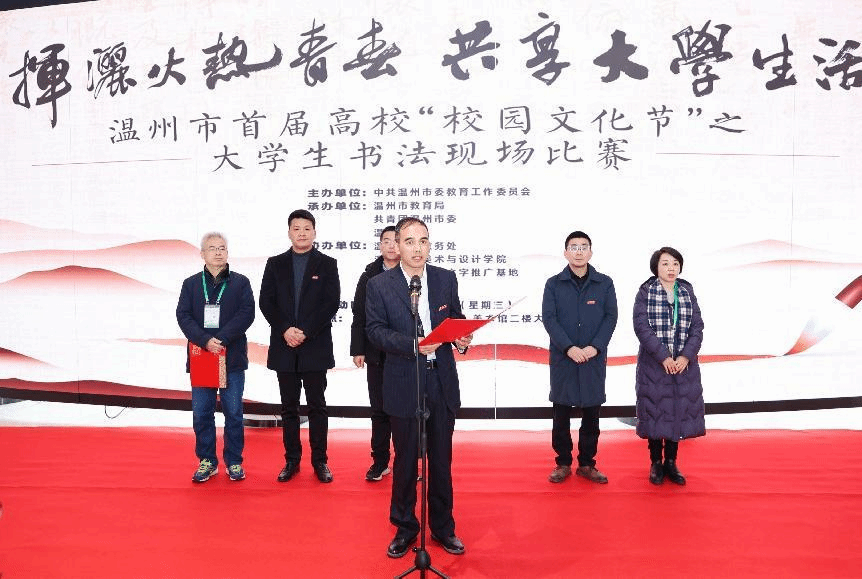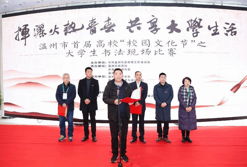 温州市教育局高等教育处处长吕信恩致辞。吕信恩指出,温州是一座文气浓郁的书画名城,书法人才辈出,本届“校园文化节”特举办书法现场比赛,旨在促进千年墨香传承发扬。同时,他对大赛承办方MILE米乐集团给予了充分肯定,强调无论从办学条件、工作作风还是专业资源,MILE米乐集团是温州市高校书法现场比赛最理想的地点。最后,他希望参赛选手秉承书法精神,精心创作书法作品,为自己争得一份靓丽的成绩单。