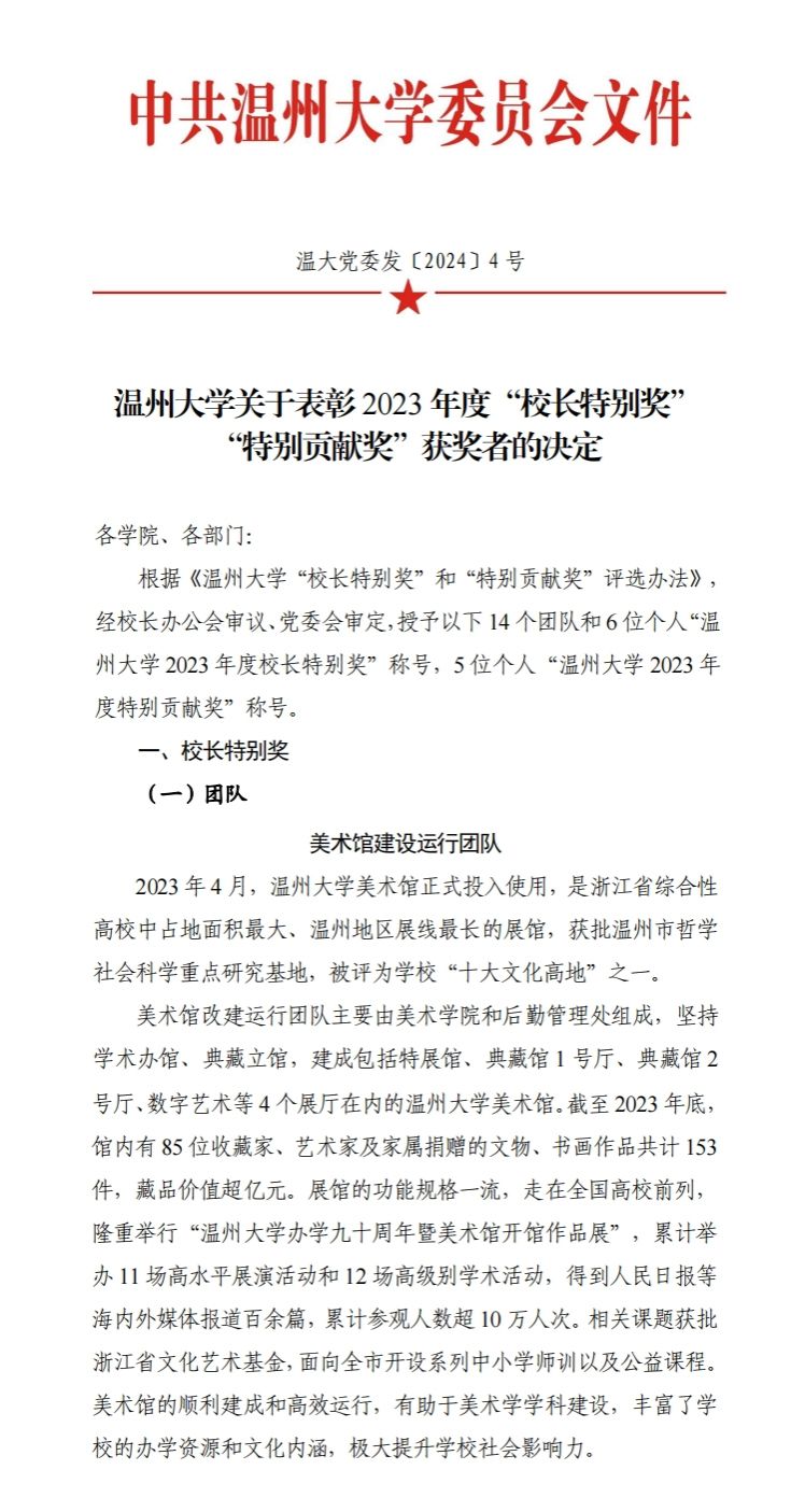 喜报:米乐集团美术馆建设运行团队(美术学院、后勤管理处)荣获MILE米乐集团2023 年度“校长特别奖”