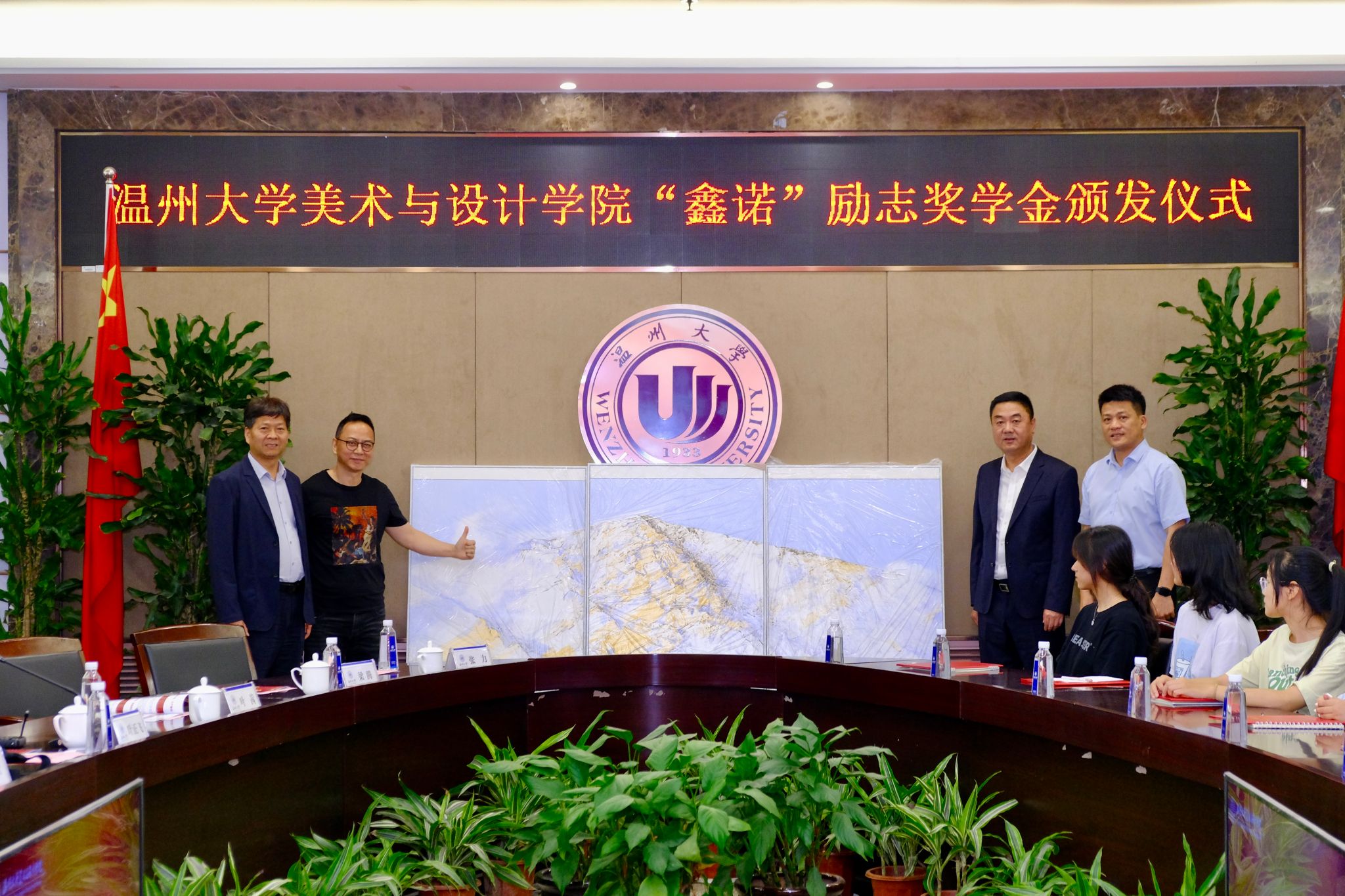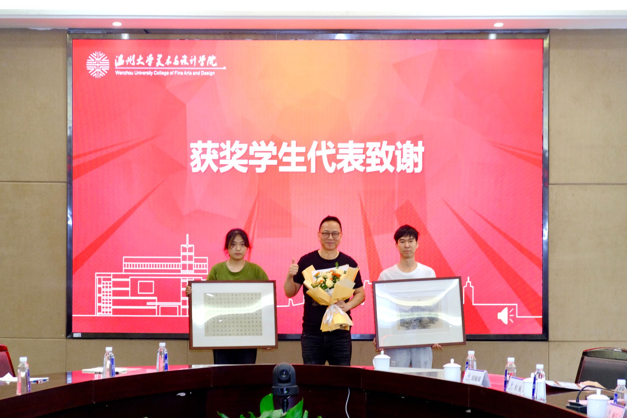 在颁奖仪式上,校党委书记钱强、校党委副书记庄兴忠赠送精美画作向刘军校友表示感谢,获奖学生代表怀着满心的感激之情向刘军校友致谢。