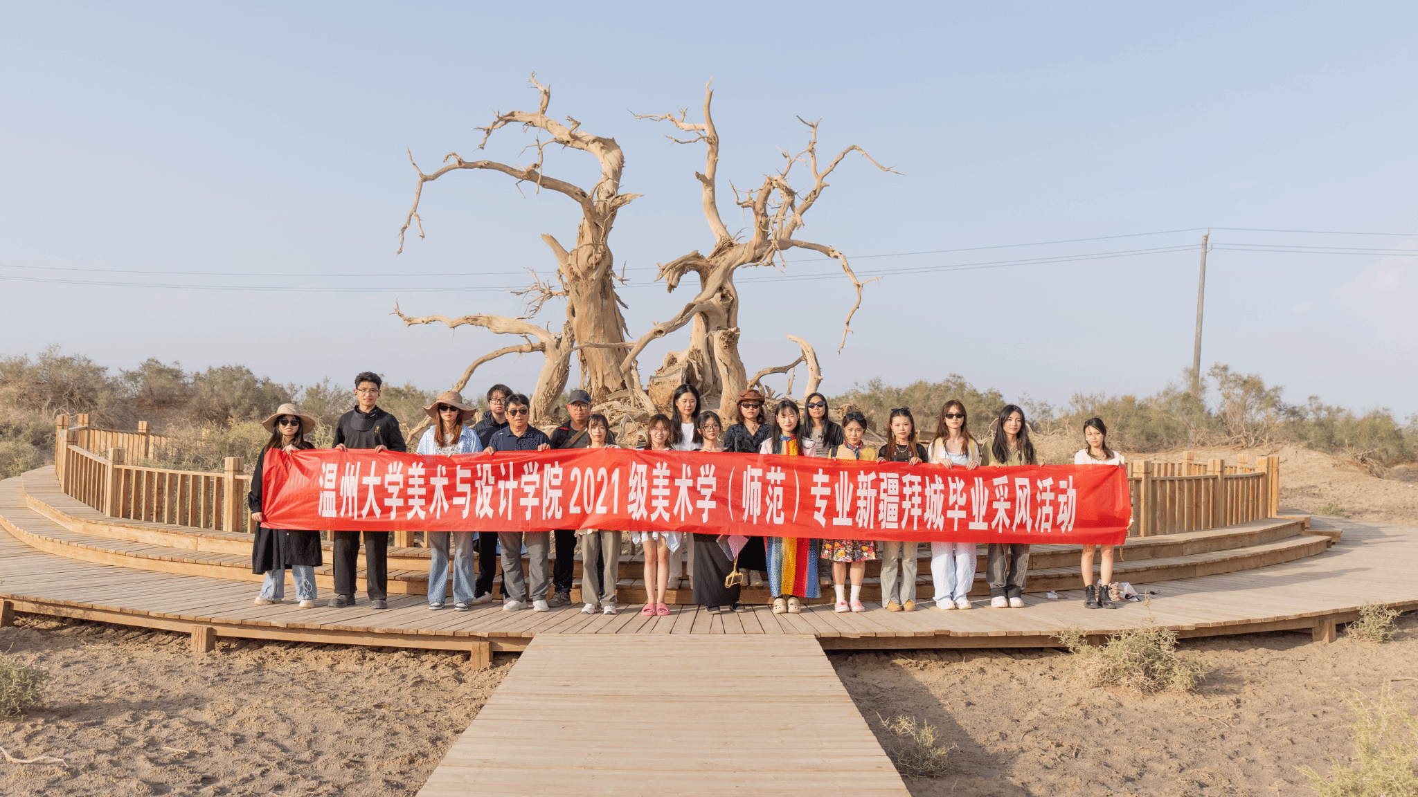 我校师生前往克孜尔石窟、红石林景区、塔克拉玛干沙漠、睡胡杨景区、苏杭村等地展开考察,实地感悟、实地领略、实地挖掘,深度体验拜城风貌之美、民俗之美、文化之美,用绘画、摄影、文字等形式记录下新疆壮美的自然风光和文化古迹,通过作品展现了拜城的锦绣风光和奇绝韵味。