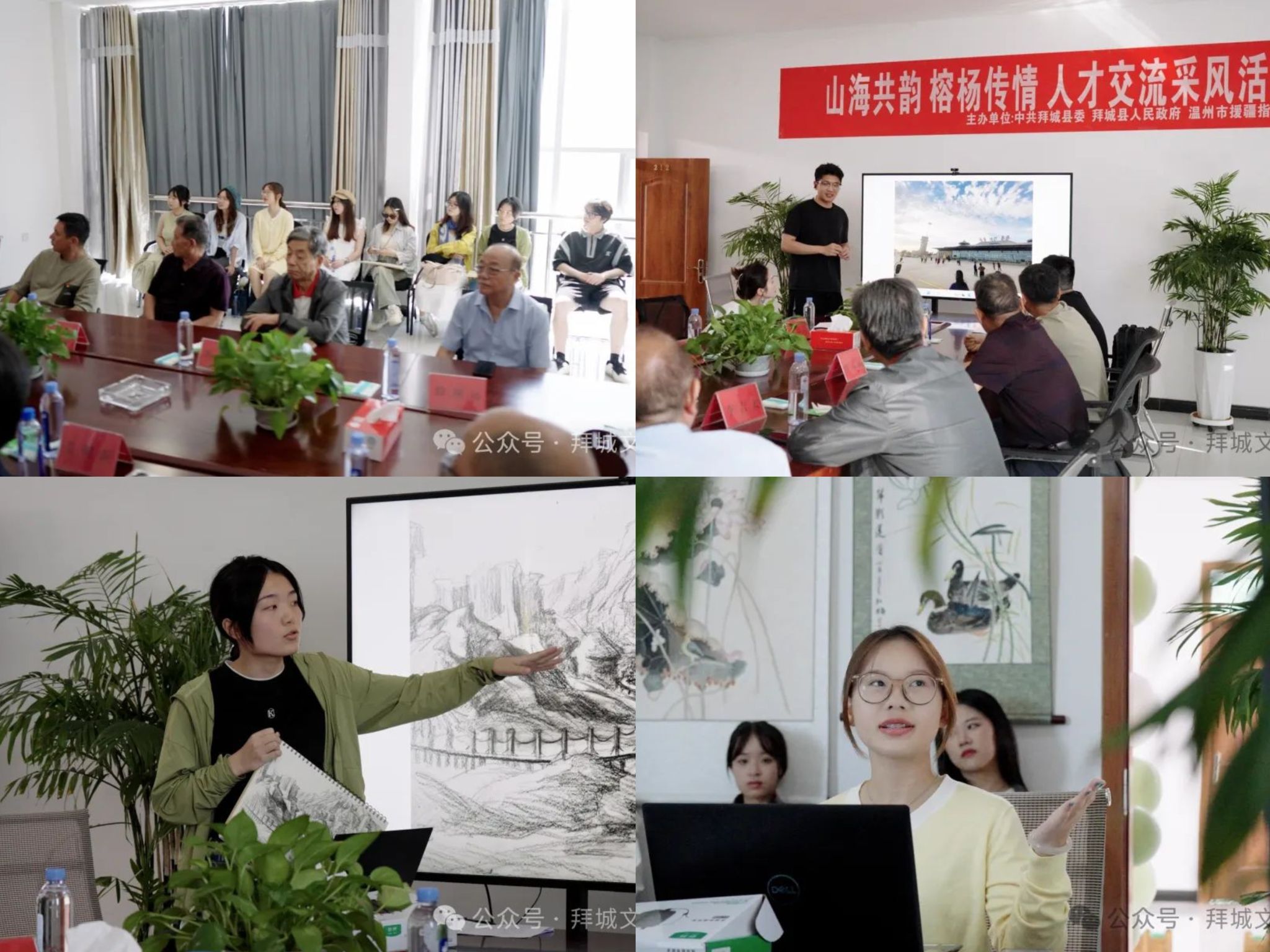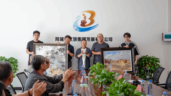 活动的最后一天,我校师生与拜城当地文艺工作者举行艺术创作交流会,展开深入的互动交流、思想碰撞。同学们介绍展示了采风期间创作的绘画、摄影作品等,并进行现场笔会,共话艺术创作的心路历程,探讨艺术灵感的源泉。一幅幅别具匠心的作品,不仅栩栩如生的彰显了大美拜城的山明水秀,也展示师生们对拜城的喜爱之情。最后,美院带队老师代表温州方面向拜城县捐赠绘画艺术作品,为活动划上圆满的句号。