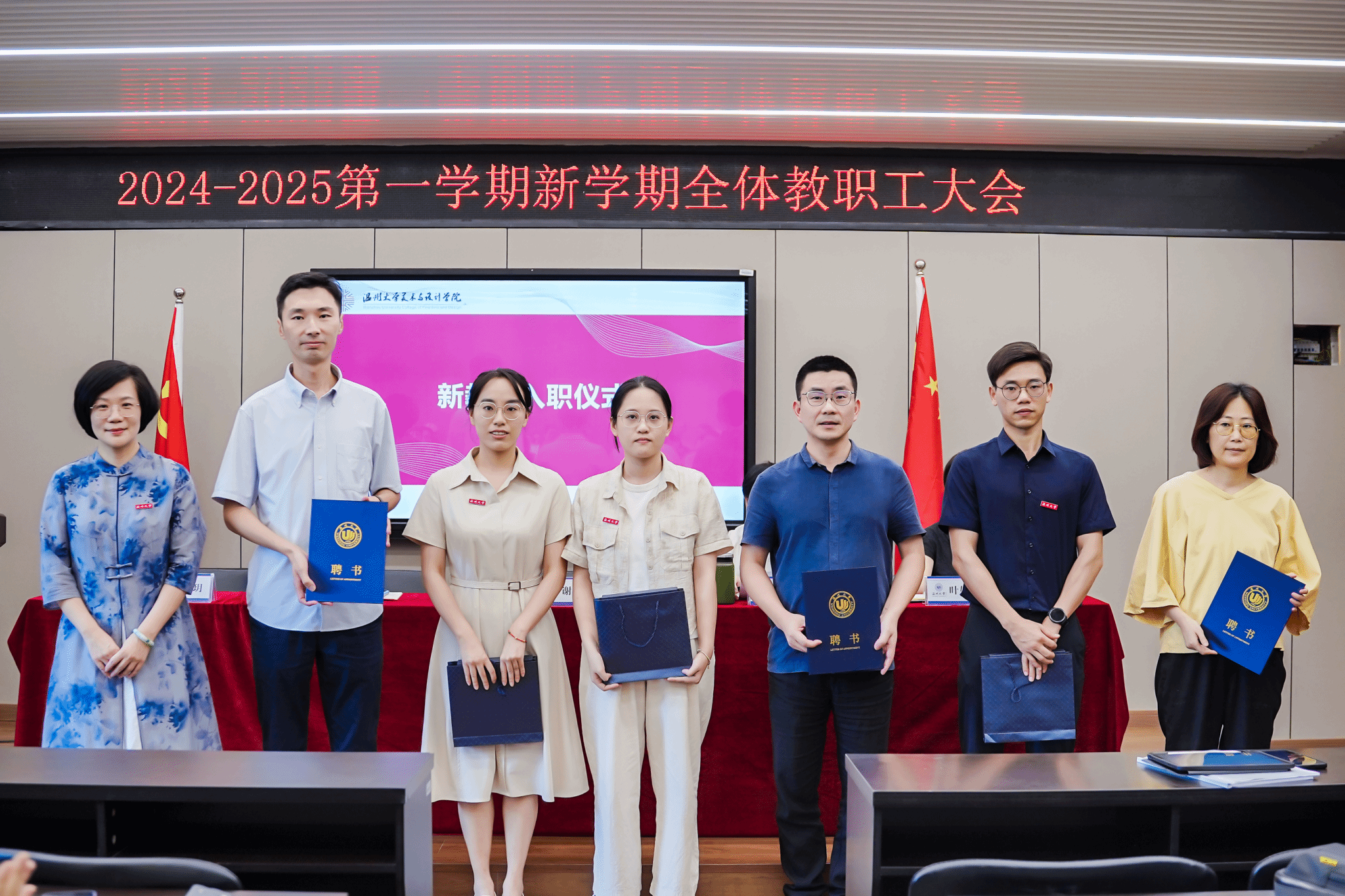恰逢第40个教师节来临之际,会上,刘青松书记对全体教职工致以诚挚的问候和祝福。会议的第一项议程,举行了新教师入职仪式,由谢子静院长为本学期三位新入职的教师佩戴校徽、赠送大礼包、颁发导师聘书。