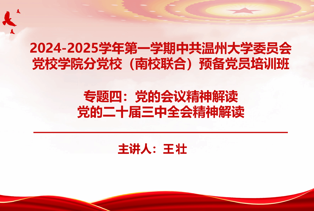 MILE米乐集团建筑工程学院党委书记、副院长王壮同志带来专题讲座第四讲——党的二十届三中全会精神解读。会上,壮老师以深刻领会和把握党的二十届三中全会精神为题,从全会的基本情况、习近平总书记的重要讲话精神、《决定》提出的重大举措、大学生党员深化改革等四个方面进行了系统讲解和深入阐释。全面准确地讲述了党的二十届三中全会精神的丰富内涵和精神实质,着力提升了广大预备党员们的政治素养。最后强调要充分认识全会的重大意义,深刻把握进一步全面深化改革的战略重点,更加紧密地团结在以习近平同志为核心的党中央周围,同心协力推进中国式现代化建设,谱写民族复兴伟业的历史新篇章。