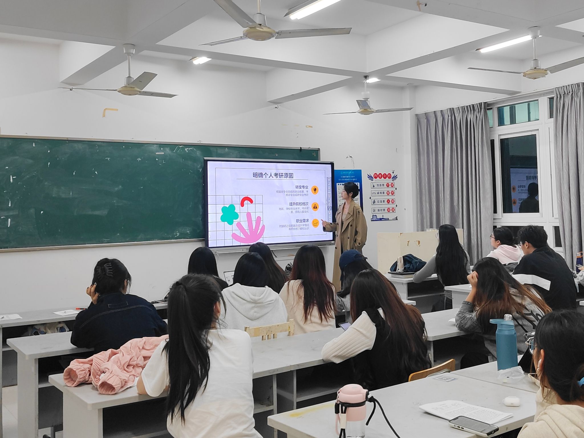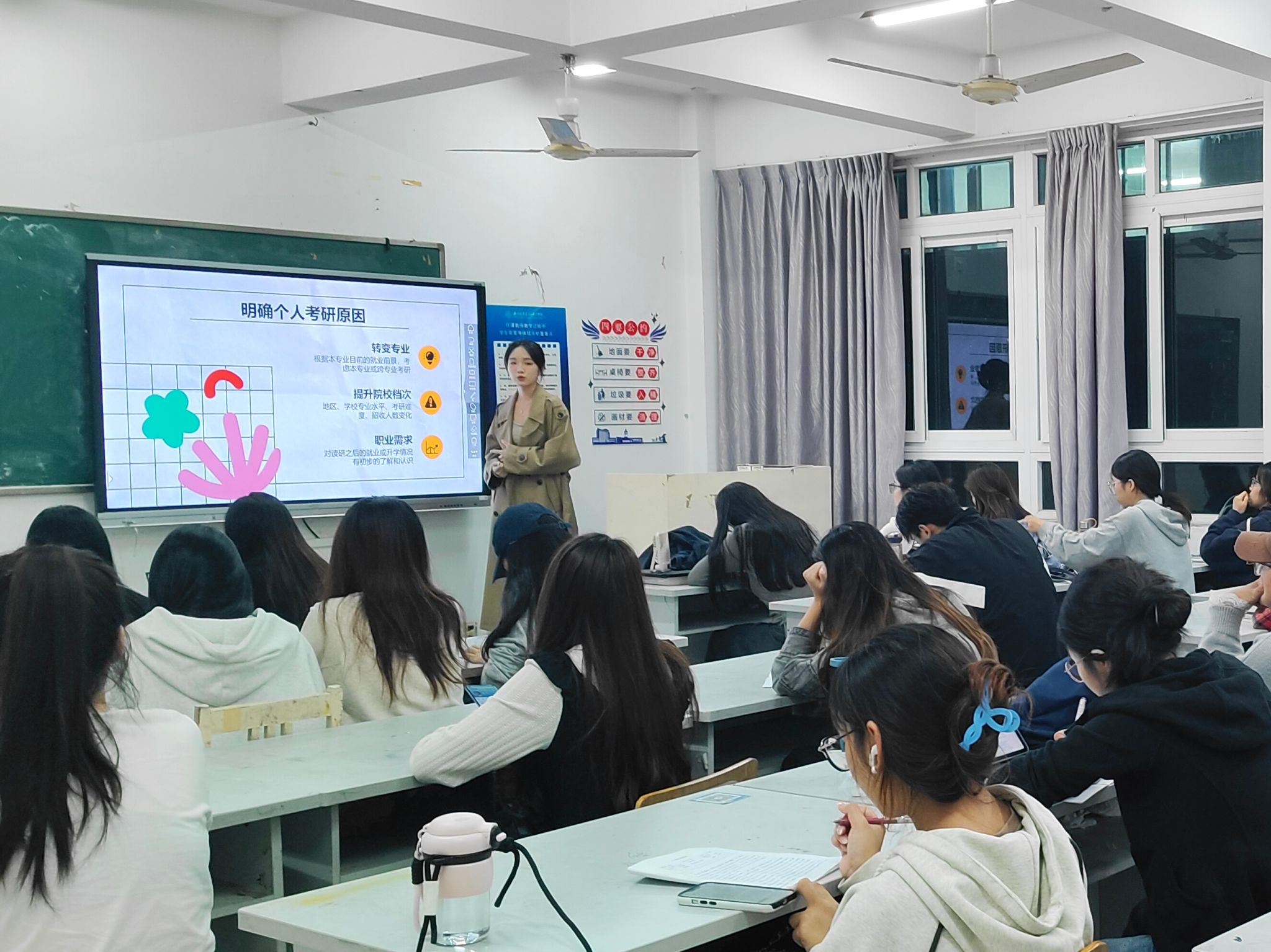 2024年11月24日,24研究生2班的杨晓凤同学进行了考研经验分享。杨晓凤同学提醒大家要综合考虑报考院校的层次和报录比,全面评估自身的学术基础、职业规划和兴趣,确保所选院校和专业既符合个人长远发展目标,又能提供适宜的成长环境。这也使同学们充分认识到考研不仅是一次知识的试炼,更是自我的探索与成长,唯有精准规划、稳扎稳打,方能在考研之路上行稳致远,达到理想目标。