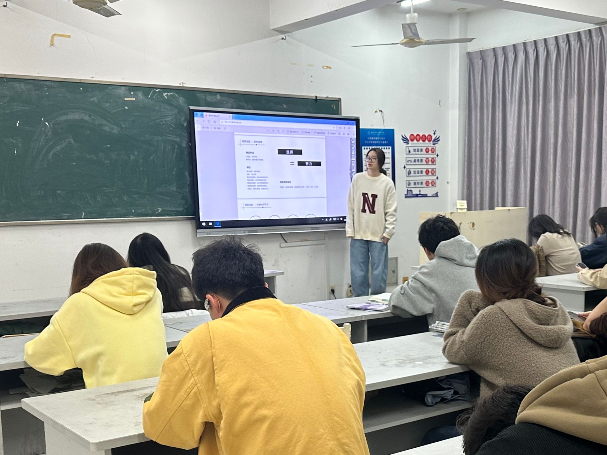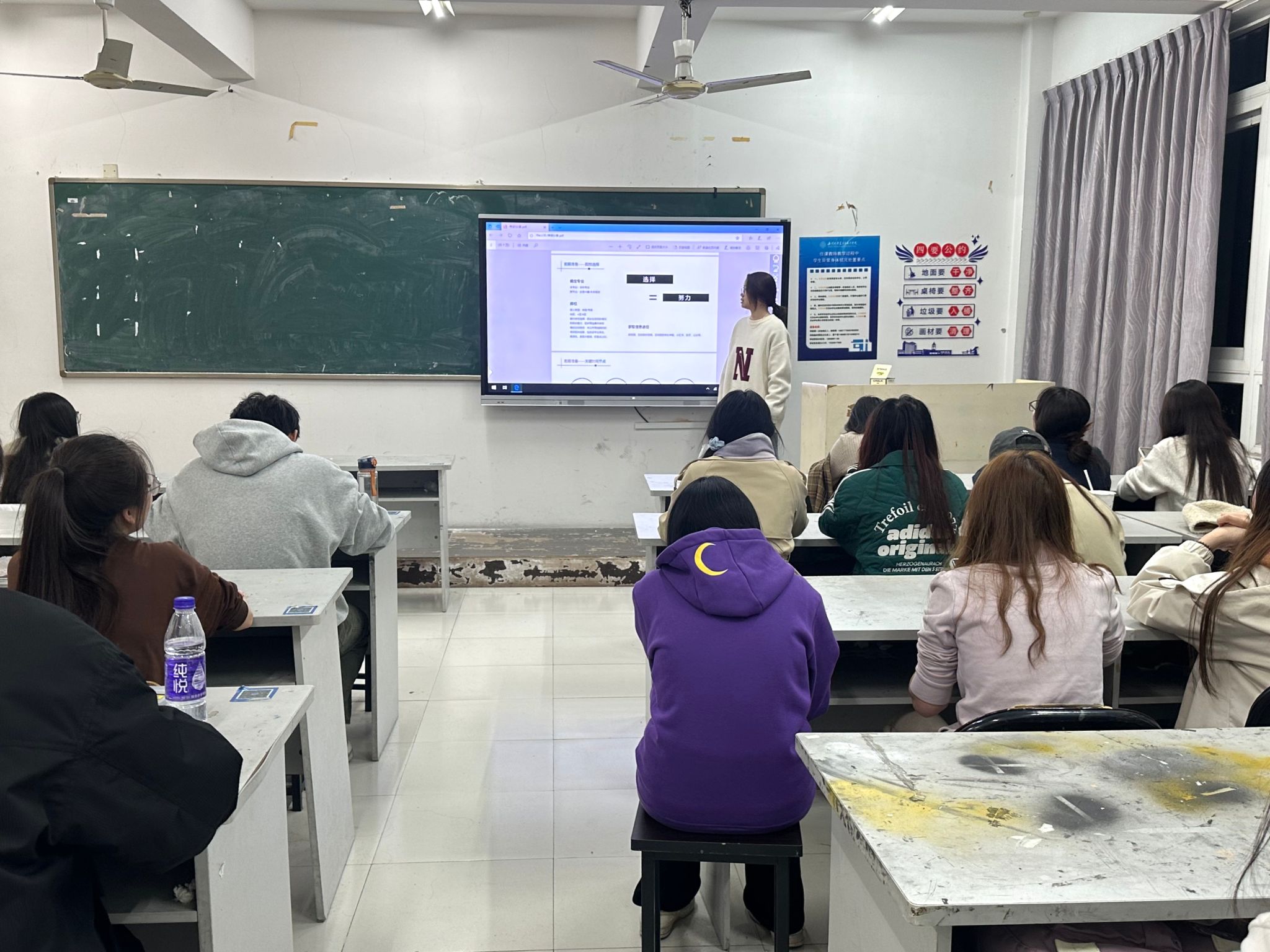 2024年11月10日,22服工班的杨涵琪同学进行了学习竞赛经验分享。杨涵琪为同学们详细介绍了自己在学习专业课程时的计划和整理方法,强调了合理安排时间、制定详细学习计划的重要性。杨涵琪同学表示,作为新时代青年,我们需要尽早确立个人发展目标,并勇敢地踏出舒适区,积极投身于科研项目和学习竞赛活动,为实现梦想打下坚实的理论基础。