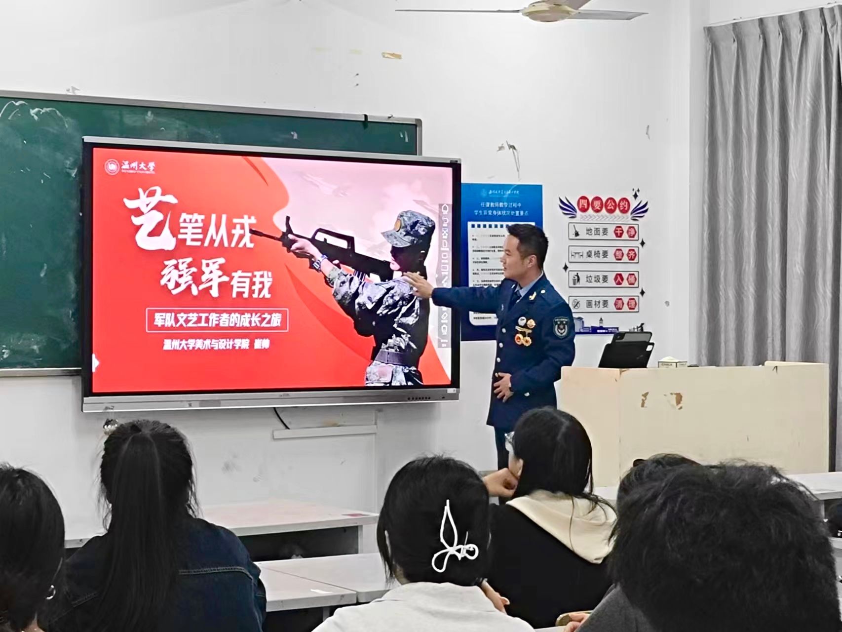 2024年10月27日,22美师3班的崔帅同学进行了军旅生活经验分享。崔帅同学讲述了自己入伍参军的初衷,为同学们分享了服役期间的收获与成长。通过这次分享,同学们深刻领略到了军人高度的纪律性、严格的组织性和强烈的使命感。这些宝贵的精神财富,为大家树立了学习的典范,激发了同学们在日常生活和未来职业生涯中勇于担当、追求卓越的决心与勇气。