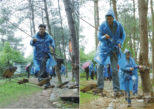 上午10点大巴车准时到达了位于楠溪江畔的永嘉书院景区。春雨迷蒙中,远山近水烟云缭绕,大家不由赞叹大自然春色的美好。在素拓教练的带领下老师们沿江岸前行,来到了林中的素拓基地。首先,在教练的指引下通过富于趣味性的小游戏完成了热身运动,也使得在平日紧张严肃的高校工作中紧绷的神经得到放松。然后,教练带领大家进行“丛林穿越”素质拓展项目,这是一项非常全面地锻炼人的肢体力量、平衡感和手脚协调性的运动。仅靠腰间一条保险绳,在离地两米高的木栈道、绳网、甚至钢丝纤上攀爬行进,看似容易其实费力而艰难,到了后半程很多稍年长的老师都体力大幅消耗汗流浃背,但大家都咬牙坚持拼力前行,一个小时内先后到达了终点。大家纷纷感叹,这不仅可以强身健体也是对意志力品质的很好锻炼。