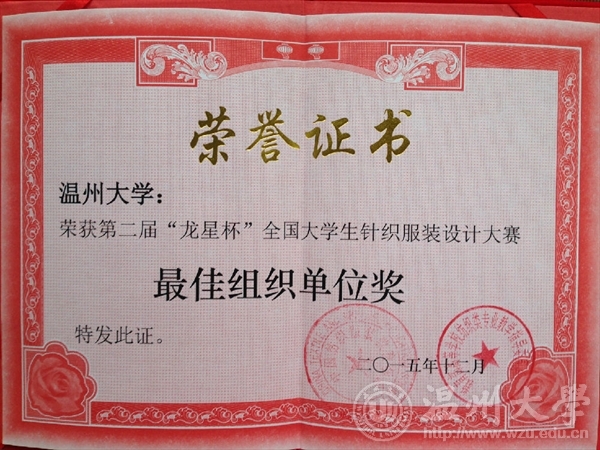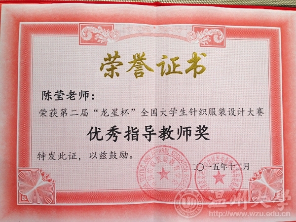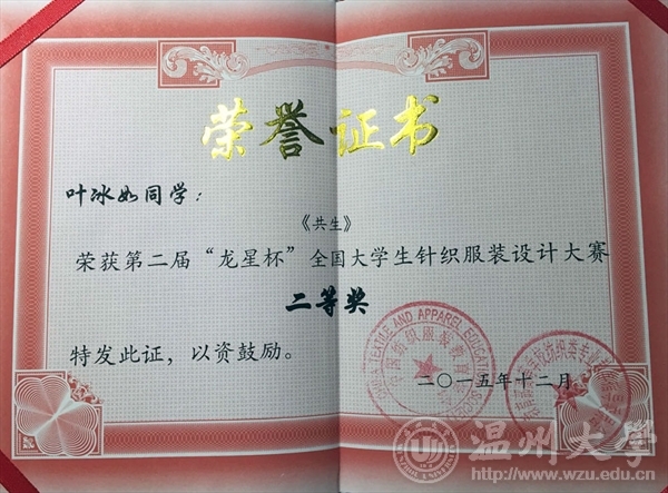 2015年12月13日,由教育部高等学校纺织类专业教学指导委员会和中国纺织服装教育学会主办、东华大学承办的第二届“龙星杯”全国大学生针织服装设计大赛颁奖典礼在东华大学举行。米乐集团12服装设计班的5名同学在陈莹老师的指导下参赛并获奖项,其中,叶冰如的作品《共生》系列获二等奖、罗璇的作品《异构空间》系列获三等奖和朱芮萱的作品《迷雾》系列获三等奖,罗勇超、徐梦然作品获优秀奖。MILE米乐集团获优秀组织奖,陈莹老师获优秀指导教师。本次大赛以“新颖、时尚、舒适、横机为你插上创新的翅膀”为主题,旨在培养大学生的创新精神和实践能力,发掘我国针织服装类设计人才。大赛于2015年3月开始启动,全国各纺织服装院校积极参与。将课程成果延伸至专业赛事,引导和鼓励学生将课程作品走出校门、亮相各类大赛,接受同行审阅和市场竞争,既是对学生专业学习能力和学习效果的检验,更是对专业课程教学效果的大考验。这是《针织服装设计与工艺》课程在2015年继参加第八届中国(大朗)毛织服装网上设计大赛,李温诗、夏婷、陈丽莎三位同学获得入围奖后的又一丰硕收获。