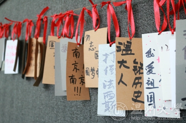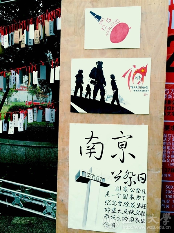 虽然天公不作美,寒风中还夹着些许雨滴,可依然浇不灭温大学子对国家公祭日的祈愿。本次活动展出了手绘悼念大海报及多张手绘宣传公祭漫画,同时开展了温大学子亲手写寄语、挂寄语活动,一同为南京大屠杀遇难人民哀悼,缅怀抗日先烈,不忘国耻,铭记历史。