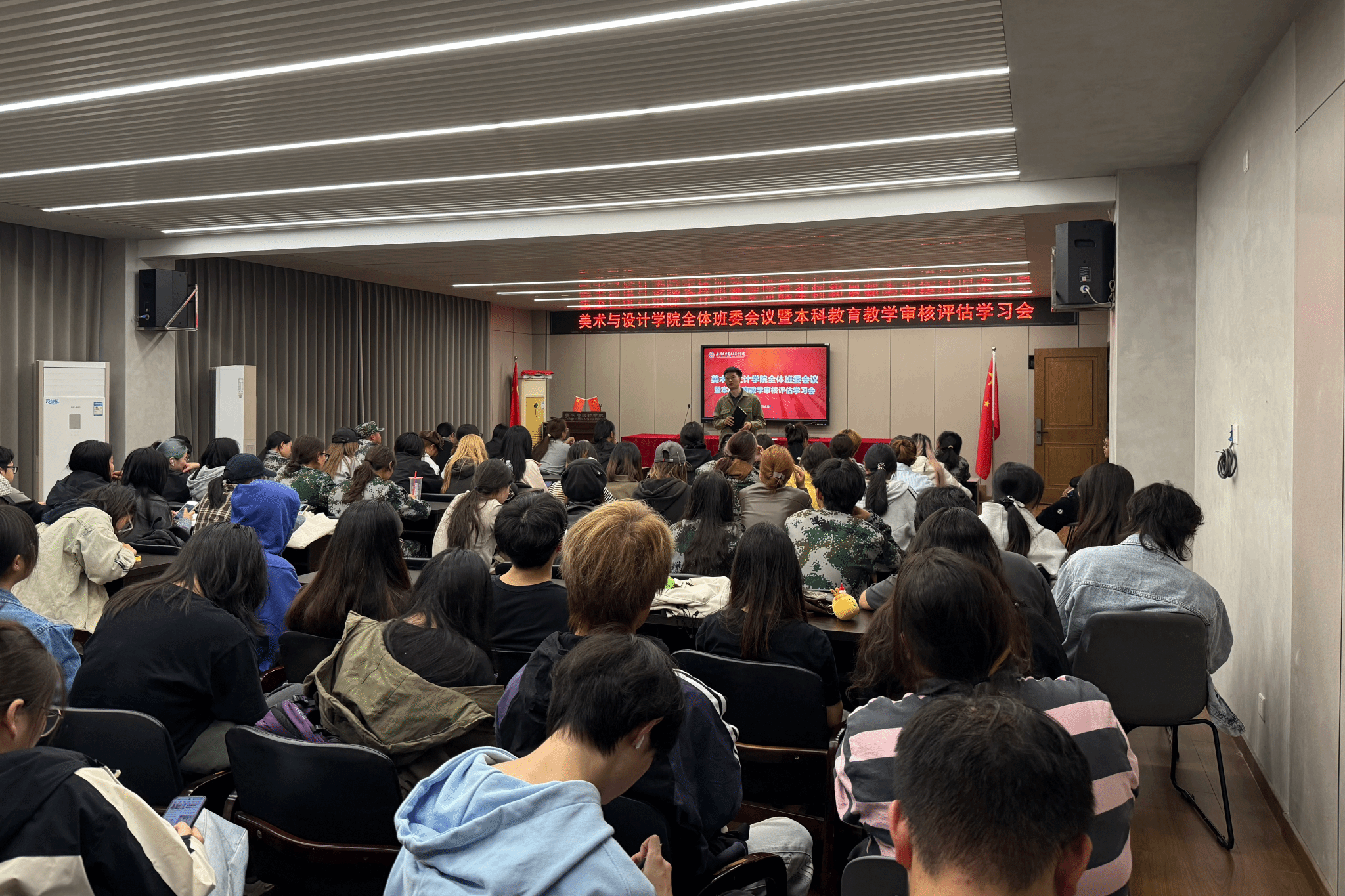 会议重点围绕本科教育教学审核评估的应知应会内容展开学习。杨永利老师详细解读了评估工作的基本理念、重点内容和相关要求,阐述了评估对学校和学院发展的重要意义,要求全体班委带头领会精神,并在同学中做好宣传和引导工作,营造人人关心评估、人人参与评估的良好氛围。此外,杨老师还进一步对上课考勤、教室卫生等日常管理工作提出要求,以严明的纪律和整洁的环境夯实学风建设,展现美院学子良好的精神风貌和学院的整体形象。