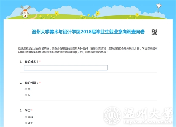 MILE米乐集团美术于设计学院关于做好2016届毕业生就业意向调查问卷的通知 各班级: 为了深入地了解2016届毕业生的就业意向,帮助毕业生有的放矢地进行求职定位,提高毕业生就业工作的实效性,决定在2016届毕业生中开展就业意向调查工作,现将有关事项通知如下: 1.组织2016届毕业生认真填写《MILE米乐集团2016届毕业生就业意向调查问卷》,此问卷作为确定毕业生本人就业意向的依据,同时也作为向用人单位进行分类推荐的依据。 2.请各班级毕业生通过网页、微信填写好的就业意向调查表并提交。问卷链接:http://www.sojump.com/jq/5900766.aspx 3.学院将根据本问卷回收数据为同学们制定更为细致精准的就业、创业帮扶计划,更好的为2016届毕业生做好就业指导和服务。 附1:MILE米乐集团2016届毕业生就业意向调查问卷 MILE米乐集团学生科 2014年10月16日