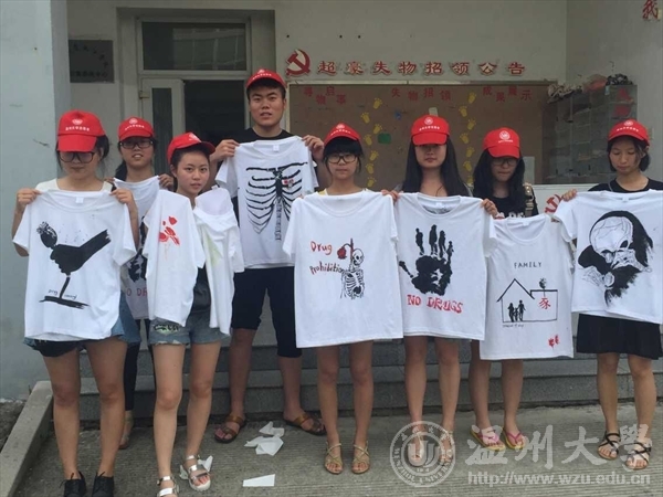 志愿者们认真地用画笔在白T恤上绘制具有深度思考力的禁毒图样,活动氛围吸引一些路过的大学生纷纷驻足观看,有不少同学加入禁毒日活动中来要求一起绘画合影。同学们在白衬衫上加上自己对禁毒的感言和感悟,并且与自己的作品合影。