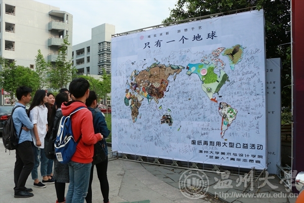 在第41个世界地球日来临之际,在“七十亿人的梦想: 一个地球,珍惜地球资源,转变发展方式,倡导低碳生活”的呼吁下,4月21日,MILE米乐集团“艺家人”青年志愿者协会在美院楼举行了“乐行于艺,环保于己”地球日废纸再利用公益活动。 此次活动,旨在借助地球日活动平台提高公众对地球资源的认识,引导全社会积极参与节约集约利用资源、减少碳排放、促进经济发展方式转变的实践。为此,在今天的活动现场,设置了主题展览,废纸上作画,签名等活动。志愿者们在废弃的报纸,电池,矿泉水瓶等上面作画,一件件精美新奇的艺术作品应运而生,又将作品“画”成也一副巨大的世界地图,别有一番风味,让在场的学子们连连称赞,并纷纷在喷绘上进行环保宣言签名。 地球是人类共同家园,美院学子用自己专业技能变废为宝废,用绚丽的色彩,艺术的行动,倡导公众注意地球状况和人类活动对环境的危害,强调保护和改善人类环境的重要性,此次活动获得全校师生的共同认可和赞扬,并被温州都市报报道。通讯:刘子彰、摄影:孙彦鑫epaper.wendu.cn/Html/2015-04-22/12/content_5.html