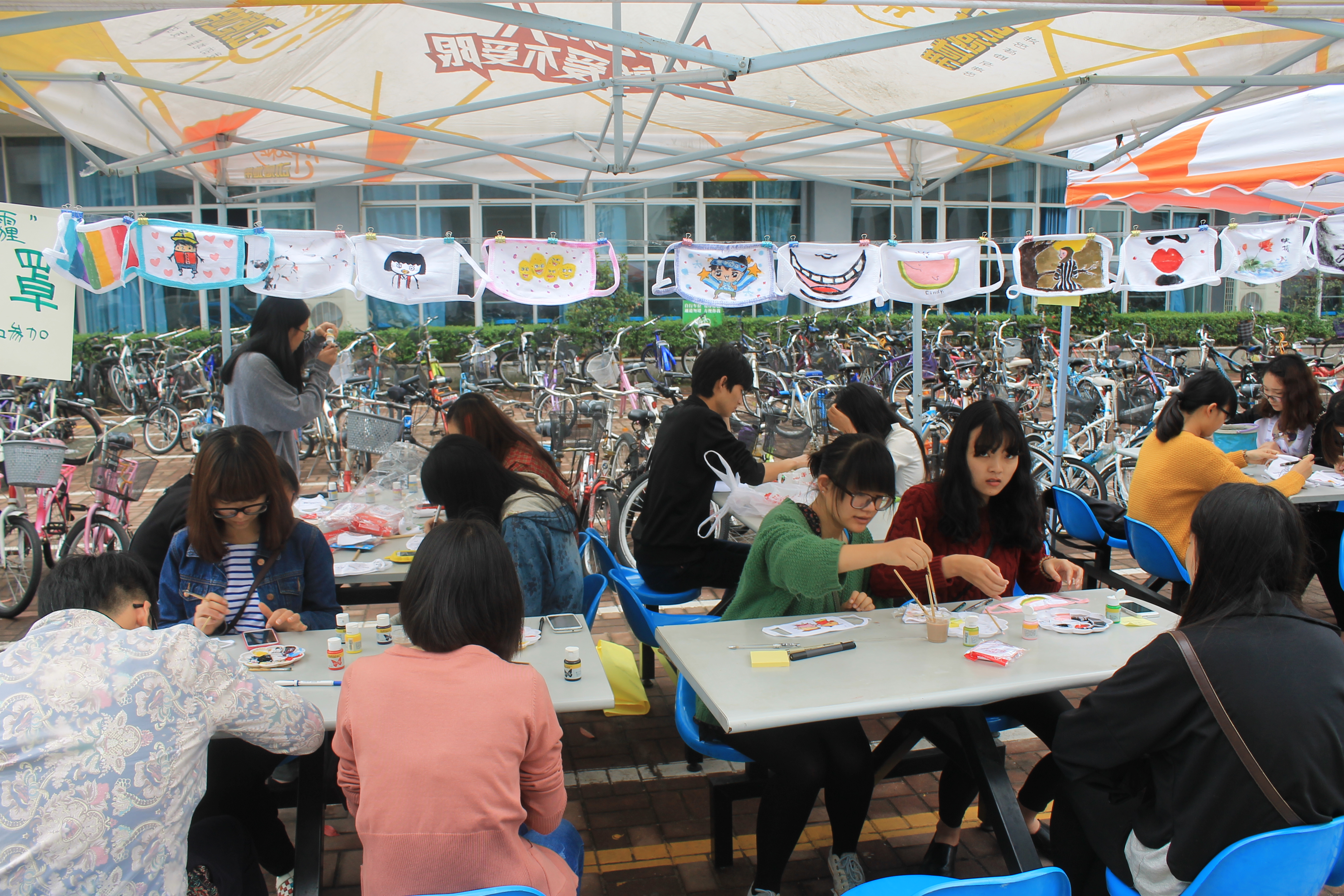 比赛现场,选手们发挥各自的奇思妙想,在口罩上绘制自己所喜爱的图画:有的是可爱的Q版卡通,有的是如诗般优美的画面,还有的是奇异诡怪的整蛊图画......选手们在绘画艺术的海洋中畅游,欣赏这如同烟雨朦朦般天气的美丽,现场气氛轻松欢愉,不时传来选手们的欢声笑语。在为时三个小时的比赛中,路过的同学们皆被这富有创意的比赛场景所吸引,愈来愈多的白色口罩“穿”上了专属定制的外衣。