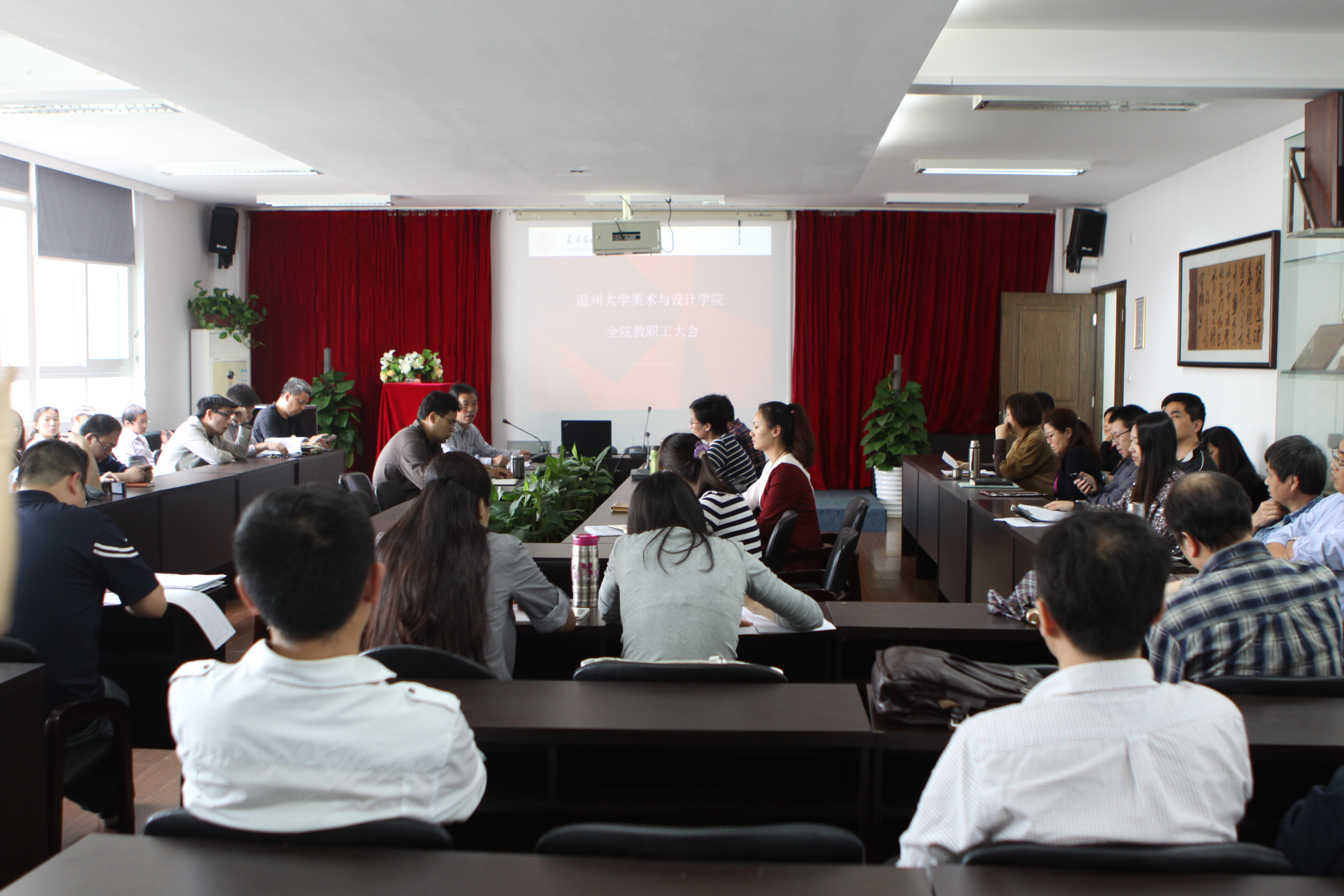 5月14日下午,米乐集团学期中全院教职工大会在2B4001多功能厅举行,院领导李运河、郑彩莲、蔡可群、杨振海及全体教职工出席。院党总支书记郑彩莲主持会议。 会上,蔡可群副院长首先就即将开展的毕业作品展、服装动态秀做了具体工作安排;对各专业人才培养方案修订做了说明,强调要加强对实验室的安全管理工作。杨振海副书记就往届毕业生就业调查、2014届毕业生就业工作及“大艺展”作品收集等工作做了说明与强调。 李运河院长对全院前阶段工作做了总结讲话。李院长首先对学校领导的人事及分工变动做了通报,随后就学院的教学、科研、对外交流等工作做了统一部署。他要求:一要时刻关注学校政策变动,保持敏感度;二要“走出去,引过来”,通过学院交流、教师参展、学院办展等多渠道、多方式加强艺术交流,营造美院艺术氛围;三要将教学、科研有机融合、紧密联系,保持追求艺术理想的同时不断提高服务地方能力;四要专业带头人要在不断凝练专业特色的同时带领团队做出更好成绩。 郑彩莲书记作了总结强调。她指出当前要强调“抓制度”、“强能力”、“促发展”,切实做好学院各项工作。毕业生作品展要提高作品质量;毕业生就业工作要脚踏实地认真做好每一环节,以保证本届毕业生的就业率和下一届的招生工作顺利进行。 会后,学院胡文超、王业宏两位老师就自己在台湾大同大学和美国康奈尔大学的访学经历与在场教师做了精彩分享。校图书馆王希老师也为米乐集团教师做了“提高资源利用、助力教学科研”的讲座。