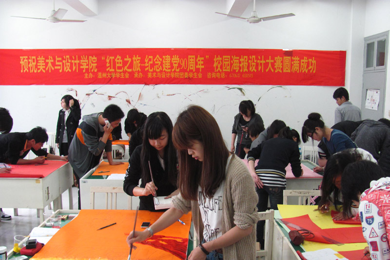 穿越氤氲的风烟,走过蒙尘的岁月,历经血战,改革和创新的风雨洗礼,中国共产党迎来了她90岁的生日。为讴歌建党90年来所取得的伟大成就,MILE米乐集团举行了一系列“红色之旅——建党90周年”主题活动。 2011年4月16日下午,由MILE米乐集团学生会主办,MILE米乐集团团委学生会承办的MILE米乐集团首届“艺生艺色”校园艺术系列大赛暨MILE米乐集团第十二届“艺苑杯”之“红色之旅——建党90周年”校园海报设计大赛活动在美院火热举行,率先拉开了颂党系列活动的序幕。 此次比赛面向全体温大学生开展,分为专业组和非专业组。以整体效果,紧扣主题,艺术美感,构思创意,作品介绍这5个方面作为评分标准。专业组分为一二三等奖,非专业组分为一二等奖和创意奖。 本次活动大概有25组专业组同学和30组非专业组的同学报名参加。天空下着大雨,每个人进来的时候都湿漉漉的,但丝毫没有影响到他们参赛的热情。同学们一个个专心致志,抓紧时间,一笔一划都耐心仔细的勾勒着,气氛十分浓郁。工作人员们为了及时给每位选手提供所需的用具也都忙碌的奔波着。 博观而约取,厚积而薄发。同学们虽没有“笔落惊风雨”之势,却也各个通过自己的精心设计,为大家展现了一场美仑美奂,精彩纷呈的书画创意设计秀。 本次活动以红色,建党为主题,主要是为了增强同学们对党的认识和了解,回顾并学习党的历史和传统,培养时刻跟着党走的意识。 90年风雨沧桑,90年岁月峥嵘,90年白驹过隙。中国共产党始终屹立在时代的顶端,历久弥新。借这次党90岁生日的机会,希望同学们可以踊跃参加一系列的红色建党活动,在这些形形色色的活动中体会到党的真谛。 文字:顾超群 摄影:顾超群