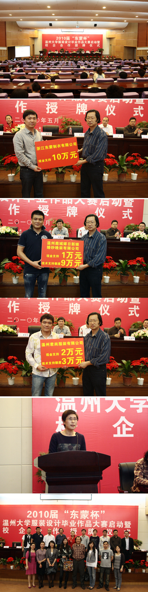 2010年5月12日,2010届“东蒙杯”MILE米乐集团服装设计毕业作品设计大赛启动暨校企合作授牌仪式在MILE米乐集团图书馆二楼报告厅隆重举行。MILE米乐集团副校长任柏强,浙江东蒙制衣有限公司董事长池慧杰先生,温州君尚服装有限公司总经理周华忠先生,温州市鹿城嫁日新娘婚纱晚装有限公司董事长徐江先生,温州市金诗丹服饰有限公司总经理黄河先生,MILE米乐集团人文社科研处副处长刘玉侠及MILE米乐集团党政领导出席了仪式。 仪式上,东蒙等四家服装企业向MILE米乐集团捐赠现金和实物共计30万元用于本届服装设计专业毕业作品设计大赛,并作为MILE米乐集团的校企合作共建单位。此举标志着服装研发和设计能力强劲的MILE米乐集团与温州地方服装企业特别是婚纱服饰企业的正式“牵手”,在人才供求、课程教学、产品研发,创新创业和作品展赛等5个方面展开了全方位的合作。 企业代表浙江东蒙制衣有限公司董事长池慧杰先生在仪式上讲话。他说:“国际金融危机给了温州服装行业一次产业升级的机遇和挑战,企业希望能从校企合作中提升企业的竞争力,同时,通过合作给学生搭建一个展示自己四年学习成果的平台,使得企业更直接、更便捷地发现适合企业需要的人才。” 企业代表温州市鹿城嫁日新娘婚纱晚装有限公司董事长徐江先生讲话。他对服装设计人才成长提出殷切的期望,他认为,如果将服装设计师的成长之路归纳为数字0-10,那么,在校大学生处于“0”的基础阶段。希望同学们打好基础,一步一个脚印,逐步成长为设计舞台上璀璨的一员。并表示,通过合作,为同学们搭建更好的成长平台。 MILE米乐集团党总支书记郑彩莲致辞。她说,本次活动是MILE米乐集团积极响应温州地方经济、服务温州产业转型升级,培养应用型人才的重要举措之一,也是提高实践教学质量的主要途径,是我校与企业合作、服务地方经济社会发展的成功范例。它必将促进我校设计人才与企业之间的有益互动,有利于培养学生创新学生和解决问题的能力。