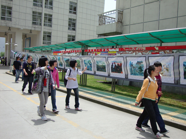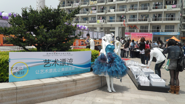 2010年4月28日对同学们来说是再普通不过的日子,与往常一样的早起赶上课、下课冲食堂。然而今天,许多同学却停下了匆匆的脚步,被一些创意独特的鞋靴、服饰等吸引,纷纷驻足在温大生活区A区,欣赏由温大MILE米乐集团主办的“艺术漂流”巡回展览。 明媚的阳光中带着焦灼,照射到展品上却犹如闪烁的镁光灯,告诉你:看这里。看这里!对!看的就是这里!无论是色彩缤纷的裙装、英气高贵的宫廷装、纯白的立体裁剪作品,或是结构严谨的环境艺术建筑模型、无限延展空间的立体构成作品都找到了自己的大批拥护者。而创意鞋靴设计作品更是打破人们的常规思维局限,使人眼前一亮。更有荣获全国鞋靴铜奖的“战国策”震撼全场。沿着展区向前走,入目的是整棚的速写作品。此时终于领悟,没有色彩的世界,纯粹的黑灰白也能无限生动,给你难以言喻的感动。再进去就是长长的艺术走廊。道路两旁挂满了数百幅师生作品。国画、书法以及篆刻了展示国粹的精华,引得参展的外国友人赞叹不已。浓彩重墨的油画、水彩自然是最受欢迎的,版画与木雕用其独一无二的形也争得个不相上下。共同点缀着艺术走廊,缺一不可。 “让美丽悄然流淌,让艺术华丽绽放。”此次艺术漂流第二站活动在学院老师大力支持下于美院大本营闪亮登场,并吸取第一站的经验与教训,可谓圆满成功,不仅为前来参观的师生上演一场饕餮盛宴,更获得院领导的一致肯定。 在此预祝艺术漂流在此后的几站中亦能举办顺利。