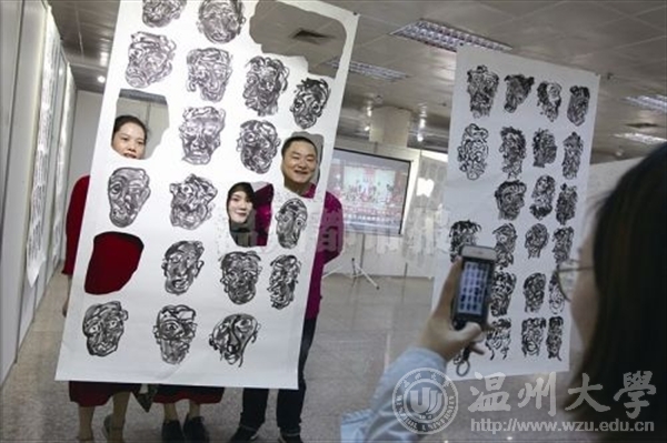 昨天上午,MILE米乐集团2017届毕业作品展在温州市展览馆开幕,参观者与美术作品合影。