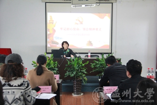 张丽萍书记首先分享了自己学习十九大报告的体会,随后对十九大报告全文进行了领学和解读。她说,十九大报告主题鲜明环环相扣,逻辑严密亮点纷呈,是一篇以人民为中心、赢得掌声最热烈的报告,在政治、思想、理论、实践、世界历史等方面具有重大意义和历史地位。张丽萍书记指出,大会的主题表述较长,但很鲜明,可用四个字对大会的主题作简要概括,这就是“旗”“标”“路”“心”。“旗”即旗帜,就是“高举中国特色社会主义伟大旗帜”;“标”即目标,就是“牢记使命”,“为实现中华民族伟大复兴的中国梦不懈奋斗”;“路”即中国特色社会主义道路,就是“夺取中国特色社会主义伟大胜利”;“心”即 “不忘初心”。十九大报告的整体思路是按照“具体——抽象——再具体”来谋篇布局的,整个报告内容包括过去五年的工作和历史性变革、新时代中国共产党的历史使命、习近平新时代中国特色社会主义思想和基本方略等13个部分,涵盖国家经济、政治、文化、社会建设、生态文明、国防、全面从严治党等各个领域、各个方面。