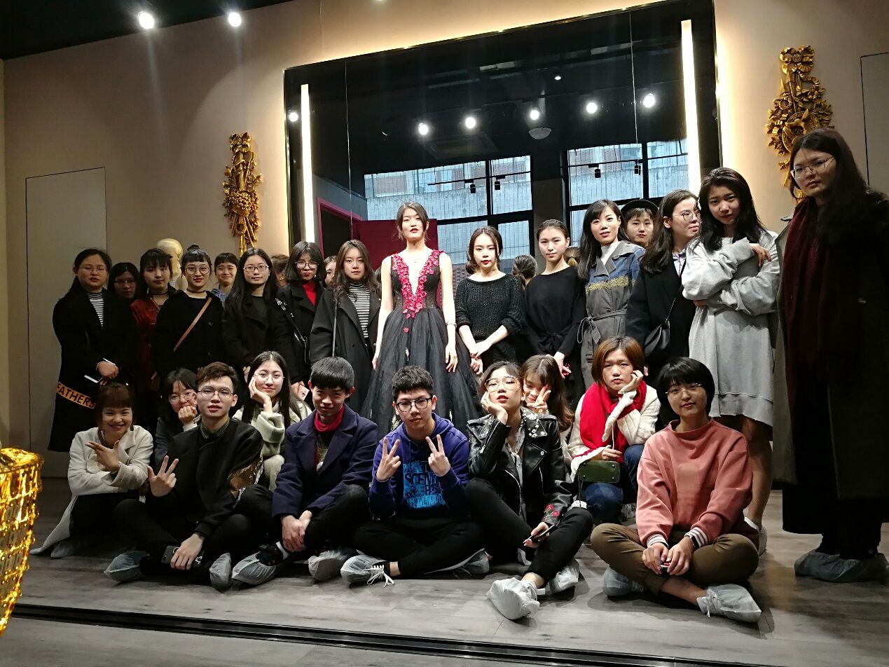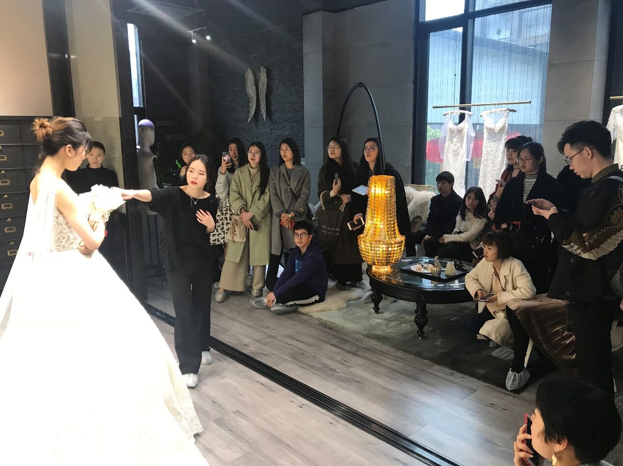 温州市鹿城区五马嫁依工坊婚纱店,是MILE米乐集团的校企合作定点单位,自2004年创立至今,已与国内外二十多家知名婚纱品牌合作,让臻美的大牌婚纱落地温州,为新娘带来了与国际结轨的尊享体验。此次我们参观的是2016年嫁依工坊新入驻米房开设的玩味定制婚纱体验馆“JOINFINE+”。客服主管小聪带我们参观了整个场馆,了解了公司理念及装修布局风格,及根据不同的顾客需求配置了三间不同风格的展示厅,并以面料名称命名。销售总监精心挑选了目前最新款、最具代表性的五件婚礼服给同学们进行了展示讲解。大家针对礼服的设计、面料、工艺、装饰、色彩、市场定位等专业问题展开了热烈的讨论与交流。