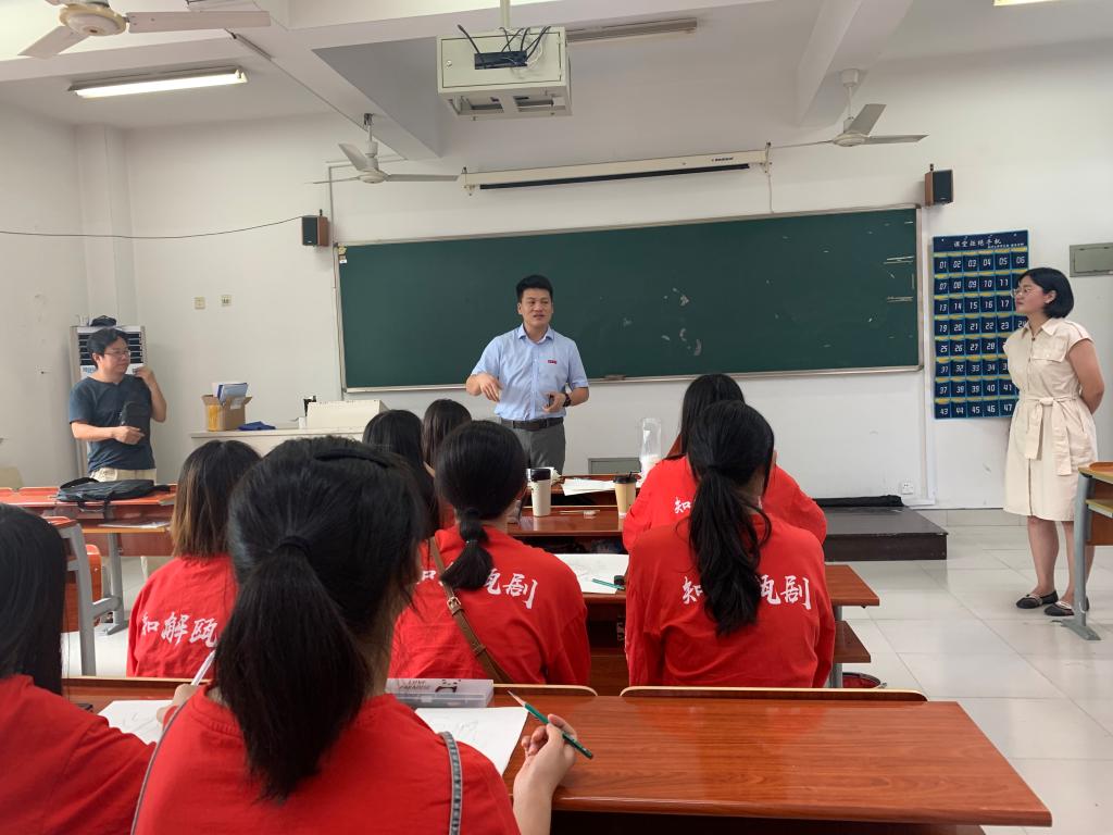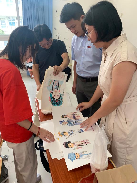初到教室,叶书记一行人受到了实践队队员们的热烈欢迎。随后,队长向叶书记介绍了实践队基本情况以及活动开展情况。当看到实践队历时两周绘制的瓯剧手绘稿时,叶书记对队员的绘画能力表示肯定,对实践队宣传瓯剧文化,精准表现瓯剧之美进行赞扬。
