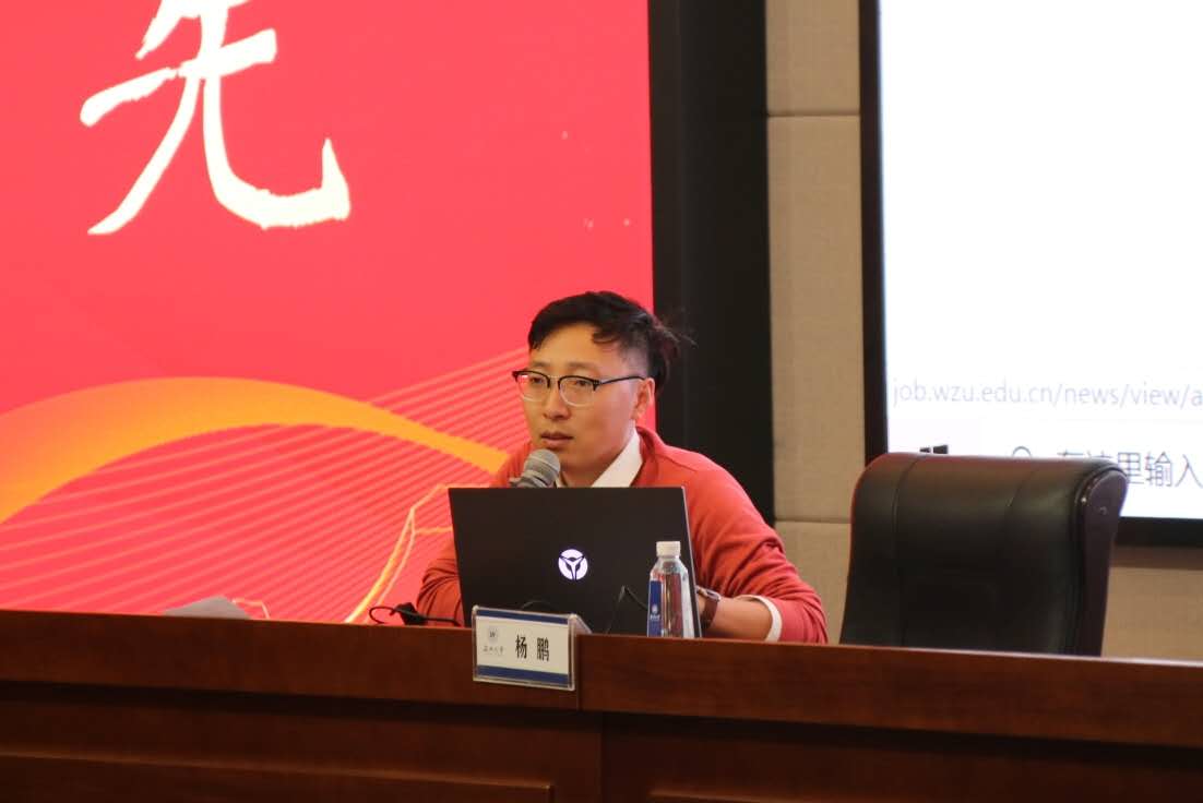 大会开始,学工办主任杨鹏老师先对就业手续、形势政策、就业 定位和应知概念等部分一一加以解读:详细讲解了我校就业系统、就业微信公众号的使用;分析了近几 年的毕业生就业形势,着重列出美院本科、硕士毕业生的就业和流向数据,为21届毕业生就业提供更多 参考;普及了毕业生应该知道的一些基本概念,提醒大家注意毕业、就业的重要时间节点,办理好三方 协议、就业劳动合同等。此外,杨老师还对毕业生留温、选调、自主创业、我校志愿服务西部计划和毕 业生困难补助等就业政策做了详细解读,并结合往年数据指导大家做出更准确的就业定位。最后,杨老 师提出大学生就职,忌贪心,忌急心,忌糊涂心,并通过实际案例对应届毕业生进行了就业安全的教育 。