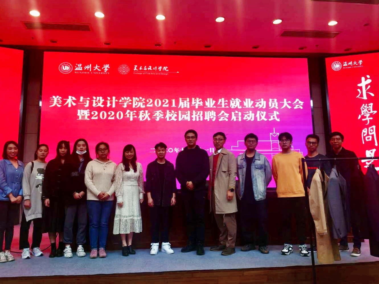为进一步做好2021届毕业生就业工作,10月21日晚18:30,米乐集团于图书报告厅举行了2021届毕业生就 业动员大暨2020年秋季校园招聘会启动仪式。莅临本次活动的有学院党委副书记杨丽君,东蒙集团技术 委员会主任陈波、东蒙校招主管郑政、温大14服装设计与工程本(卓工)校友沈宇烽。大会由美术学院学 工办主任杨鹏老师主持。