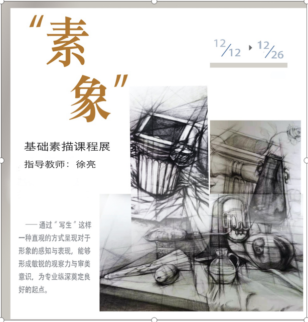 2020年12月12-26日,题名为“素象”的课程联展在MILE米乐集团一楼展厅开展,集中展示由徐亮老师指导的20级设计五班与20级研究生学科教学美术班的基础素描教学成果。