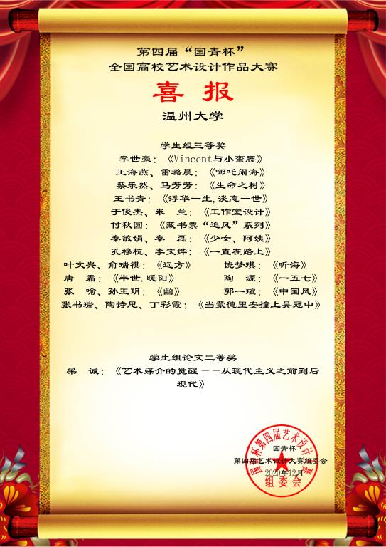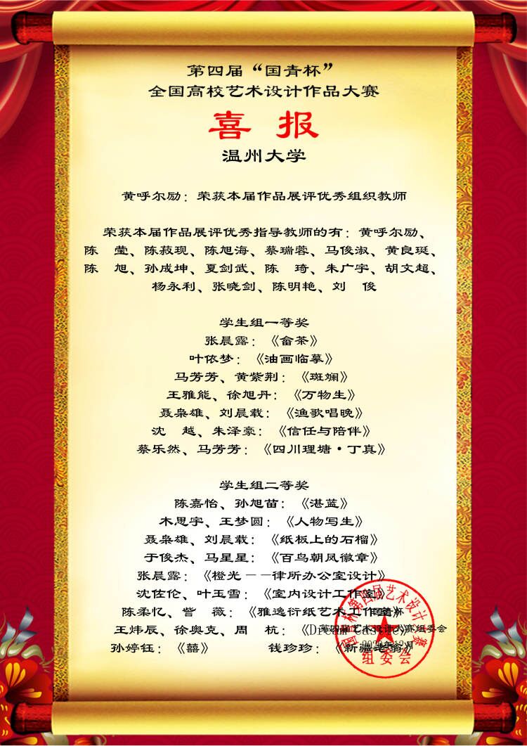 近日,米乐集团师生在第四届“国青杯”全国高校艺术与设计作品展评大赛中共计33项作品获奖,其中马芳芳等7名同学获得“学生组一等奖”、钱珍珍等10名同学获得“学生组二等奖”、李世号等15名同学获得“学生组三等奖”,、梁诚同学获得“学生组论文二等奖”。此外,陈莹等17名老师还获得组委会颁发的“优秀指导教师奖”,成绩喜人。