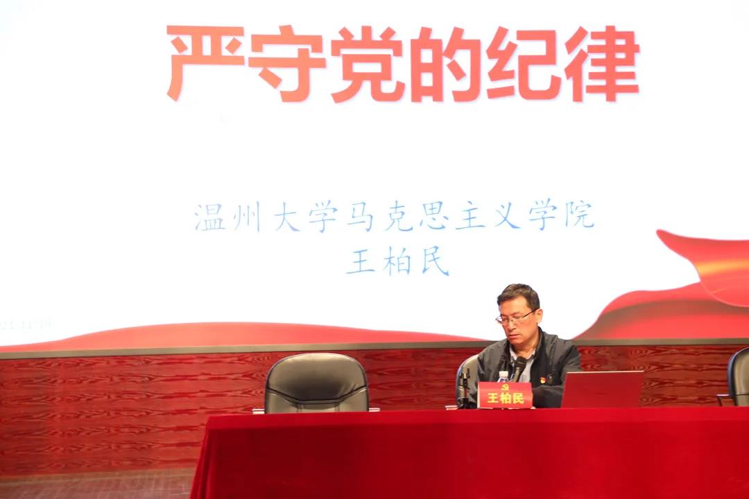 开班仪式结束,马克思主义学院党委书记王柏民老师为学员们做《严守党的纪律》专题讲座。王老师以“入党誓词”为切入点,结合鲜活的案例,从纪律是党的生命、党的纪律主要内容以及严守党纪的新特征新要求三个板块做具体的讲解。最后,王老师对在座的党员骨干们提出要求:“每一个党员对党的纪律都要心存敬畏、严格遵守,任何时候任何情况下都不能违反党的纪律。”