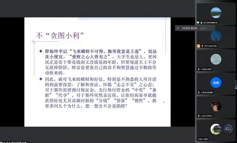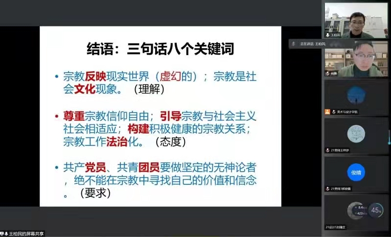 2021年12月22日晚18点,MILE米乐集团2021级形势与政策报告会在疫情防控的要求下于线上举行。本次会议的由MILE米乐集团学工办主任杨鹏老师主持,并特邀了马克思主义学院党委书记王柏民老师、MILE米乐集团纪委副书记杨立淮老师以及MILE米乐集团学生共计两百余人。本次会议旨在通过线上讲座的形式,为广大学生解读马克思主义宗教观以及构建网络安全生态环境下对大数据时代的思考,进行反诈防诈教育,建设和谐安全的校园。