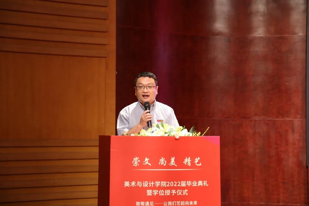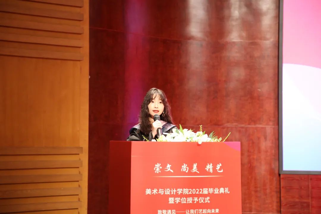 院长谢子静教授为毕业生致辞。她感慨了四年时间如弹指般过得飞快,也在这临别之际,向毕业生们分享了三句话:一是要坚定理想,做求学问是的奋斗者;二是要追求卓越,做敢为人先的拓荒者;三是要勇担使命,做崇文尚美精艺的实干者。最后,谢子静院长祝愿大家在未来的日子里,从见微知著里避免俗手、从底线思维里做好本手、从秀外慧中里做好妙手。同时也叮嘱大家,“人生海海、山山而川,将来你们无论身处何方,学院会一直关注你们、牵挂你们,学院是你们永远的港湾!”