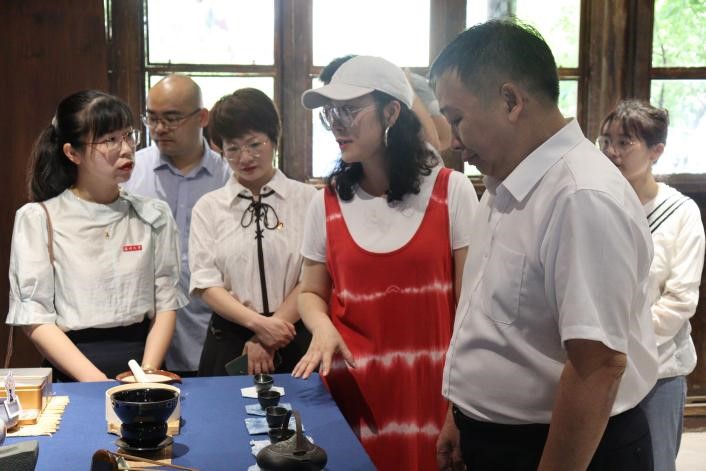 赵敏校长先后参观了几个体验区域并仔细聆听了学生的介绍与实践心得。期间,学生展示了南戏研学项目、戏曲IP热转印和蓝染产品与宋式点茶的结合形式以及相关文创产品。赵敏校长对于南戏与蓝夹缬同现代生活用品结合、蓝夹缬的再应用与灰染的结合、纯天然无污染的传统染色技艺表示了肯定,还亲自上手体验了一把蓝染的乐趣。