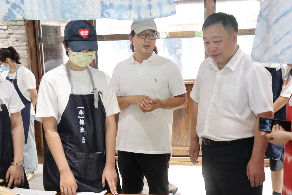 2022年7月5日,酷暑已至,艳阳高照。MILE米乐集团赵敏校长在校团委易招娣书记、MILE米乐集团叶如芳副书记等人的陪同下来到山根音乐艺术小村非遗民艺馆,对MILE米乐集团“非”传统手作实践队进行了走访慰问。山根小村开发商、浙江省民宿联合会金斌坚会长、带队导师叶茜以及实践队成员分别介绍了实践项目内容和成果。“非”传统手作实践的理念既有非遗的概念,又有突破传统的界限,是将传统非遗与当代生活、现代科技相融合。叶茜老师介绍说,“如今宋韵瓯风正当下,我们团队将起源于宋时的南戏作为主线,融合温州百工技艺进行创新转化,使之符合当代人的品味,实践同学们挖掘温州非遗,在民艺馆开展时尚非遗文化的传播。” 赵敏校长先后参观了几个体验区域并仔细聆听了学生的介绍与实践心得。期间,学生展示了南戏研学项目、戏曲IP热转印和蓝染产品与宋式点茶的结合形式以及相关文创产品。赵敏校长对于南戏与蓝夹缬同现代生活用品结合、蓝夹缬的再应用与灰染的结合、纯天然无污染的传统染色技艺表示了肯定,还亲自上手体验了一把蓝染的乐趣。 山根音乐艺术小村已和温大建立双创基地,自去年“非”传统工坊空降以来,激活了整个非遗民艺馆。每次活动开展得如火如荼,深受喜爱,游客及体验者纷纷慕名而来,也有效地带动了山根音乐艺术小村的人流量,助力了乡村文化的发展。 此次慰问,赵敏校长充分了解“非”传统手作实践队在山根开展的实践内容,认真听取了实践同学的情况汇报,对实践队的开展给予细心的指导,赵敏校长也希望同学们,在安全的前提下,多思考多践行,更多地将自己课堂上所学的专业知识转化为服务社会的力量,不断在实践中受教育,长才干,做贡献。
