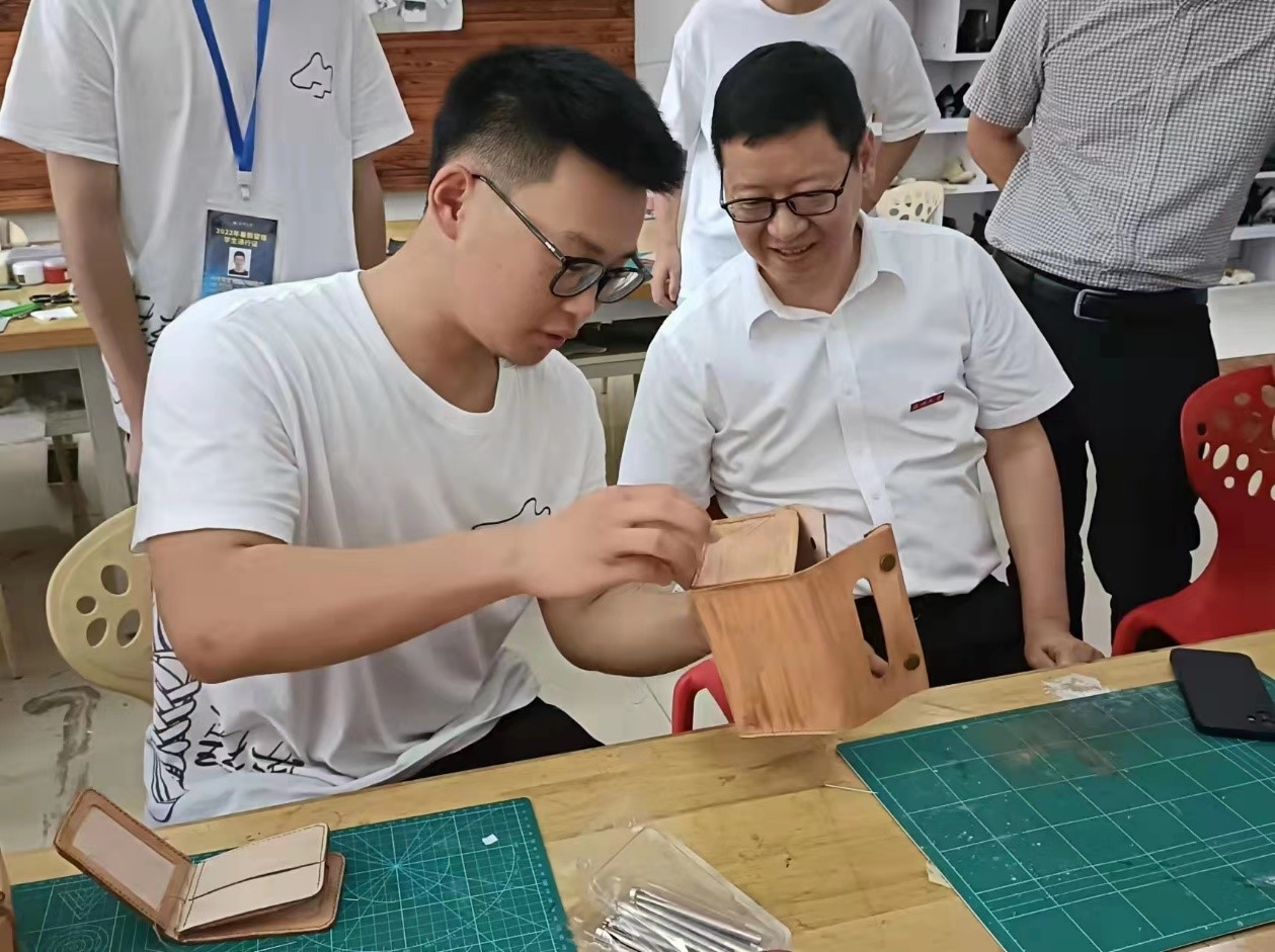 座谈会结束后,郑信军部长应邀来参观鞋蕴传承实践队实践基地,与同学们亲切交流了有关实践的内容感想,并亲手体验了皮革制品的制作过程,给予了肯定。