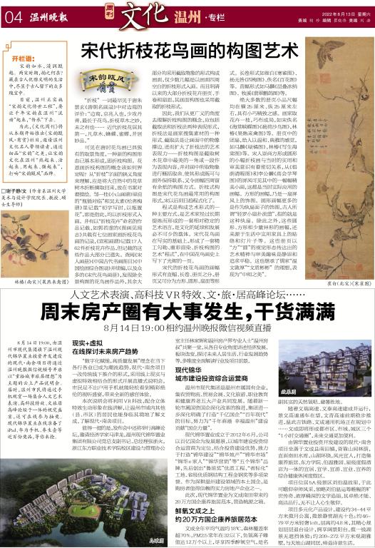 宋韵如水,浸润瓯越。两宋时期,韵之何在?藏在古人温雅文明的生活中,尽显于古人留下的众多瑰宝中。千年宋韵风华,数不清,道不尽。目前,温州正实施“宋韵文化传世工程”,要让千年宋韵在温州“流动”起来,“传承”下去。为此,《文化周刊》将从本期开始推出《宋韵瓯风·有赏》栏目,邀请温州文化名人带领读者,通过细品“宋韵”之美,让宋韵文化在温州“热起来、活起来、用起来、强起来”,打响“宋韵瓯风”品牌。谢子静 系MILE米乐集团院长、教授、硕士生导师“折枝” 一词最早见于唐朱景玄《唐朝名画录》中对边鸾的评价:“边鸾,京兆人也,少攻丹青,最长于花鸟,折枝草木之妙,未之有也…… 近代折枝花居其第一,凡草木、蜂蝶、雀蝉,并居妙品。”另外《宣和画谱》记载:“边鸾,长安人,以丹青驰誉于时,尤长于花鸟……又作折枝花,亦曲尽其妙。”可见在唐时花鸟画已具独有的取景角度,一种新的构图形态已基本形成,即折枝构图。花恩画折枝构图的概念该如何界定呢?从“折枝”字 面的狭义角度来理解,应是将大自然中的花草树木折断摘取回来,放在书案对着描绘。邹一桂《小山画谱》里说的“瓶插对临”和吴太素《松斋梅谱》里记载“初学写时,以瓶置花”,即是指此,均以折枝形式入画。并有以“折枝花卉”命名的作品记载,如郭若虚的《画见闻志》共载有七位画家画折枝花鸟画的记录,《宣和画谱》记载17人62件 折枝花卉作品,但记载的这些作品大部分已遗失。查阅《宋人画册》《中国古代书画图目》《中国绘画综合图录》并续编,以及众多的《宋代花鸟画册》,发现除全景构图的花鸟画作品外,其余大部分均采用截取物象的形式构成画面,仅少数几幅是以画面四周空白的折枝形式入画。而且明清以来的大部分折枝花卉册页、手卷和扇面,其画面构图采用的也是截取的折枝形式。崔白(北宋)《寒雀图》因此,我们从更广义的角度去理解折枝构图的概念,应包括截取法和折枝法两种表现形式,折枝法是画家搜集素材的一种形式,截取法是让画面中的物像撑边,进而扩大了折枝法的艺术表现力——折枝构图是截取树木花草中最美的一角或一段作为表现内容,并对画中所取物象进行概括取舍,使其形成既可与画外保持联系,又令画幅四周留有余纸的构图方式。其构成法则运用灵活,结构组合丰富变化,内涵深广且法度严谨。折枝式构图是宋代花鸟画最常用的构图形式,宋以后则日趋程式化了。程式是构成艺术形式的一种主要方式,是艺术家经过长期提炼而形成的一套相对稳定的艺术语言,是文化的延续和发展必不可少的载体。宋代花鸟画在写实的基础上,形成了一套精工勾勒、重彩渲染、折枝构图的艺术“程式”,在中国花鸟画史上写下了光辉的一页。宋代的折枝花鸟画的画幅形式有直幅、长卷、册页之分,册页又可分为方形、圆形、扇面等形式。长卷形式如崔白《寒雀图》、扬无咎《四梅图》、佚名《百花图》等。直幅形式如马麟《层叠冰绡图》、牧溪《翡翠鹳鸽图》等。佚名(南宋)《疏荷沙鸟图》绝大多数的册页小品尺幅均在横25厘米、纵25厘米左右,具有小巧精致之感。画家取花卉一枝,巧布成局,如宋佚名《海棠峡蝶图》《疏荷沙鸟图》,林椿《果熟来禽图》等。册页中的团扇,给人以温和、典雅的感觉,如马麟《绿橘图》,林椿《写生海棠图》等。还有一些其它形式的扇面,具有随意、亲切之感,如佚名《豆花蜻蜓图》等。佚名(南宋)《海棠峡蝶图》宋人崇尚方形或圆形的小幅折枝画与当时的实用和审美意识有着密切关系,从《梧荫清暇图》和李公麟《高会学琴图》的屏风可见其中的一幅幅精美小画,这都是当时实际应用的画幅。方形的画幅,乃是一扇屏风上的饰图。圆形画幅更多的是作为纨扇面子的饰图,古人所谓“轻罗小扇扑流萤”,指的就是这种纨扇。除此之外,这些圆形、方形和少量异形的画幅,还来源于生活中实用家具上的贴络和灯片子等。这些册页以“方”“圆”的视觉形态传达出的艺术精神与审美趣味是静思和追求平稳。这也继承了儒家“温文敦厚”“文质彬彬”的理想,表现为“中和之美”。按康定斯基的说法,正方形在公式性的基础平面中是最客观的形态,寒冷感和暖和感保持着相对均衡,而圆形则是最接近不带色彩的静止的平面形态。林椿(南宋)《果熟来禽图》