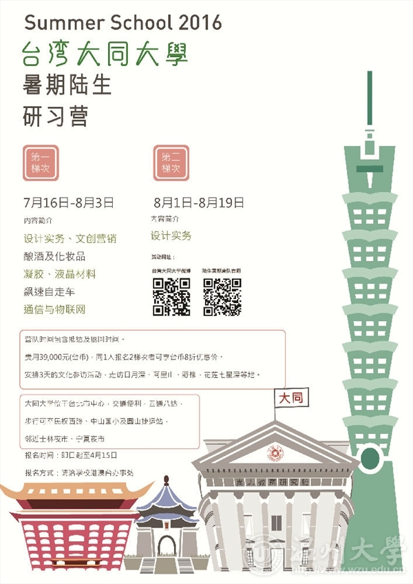 2016年暑期赴台湾大同大学设计营报名通知 一、活动宗旨: 近年来,两岸四地高校间学术活动交流频繁,大同大学为促进两岸师生进行交流与彼此认识,鼓励两岸学子建立深层情感并体验台湾之美。大同大学依据各学院系所专业特色,为大陆地区优秀学子量身打造各种专业营队活动:如商业领域之文创营销、工程领域之酿酒和化妆品、机电整合自走车、无线通信与物联网等主题实作课程,以及创意无限的设计实务等各项不同领域之深刻体验课程。相信参与的学子必能对台湾风情与大同大学各领域专业表现有深刻感动,并藉此营队激荡出更多脑力火花,促进双方交流与深层理解。 二、时间:第一梯次 营队 课程时间:2016年7月16日- 8月3 日第二梯次 营队 课程时间:2016年8月01日-8 月19日三、范围: MILE米乐集团本科2、3年级在读学生 四、人数: 10名五、费用: 一梯次39,000元新台币/人(折合人民币7800元/人),费用含研修费、住宿费、办证费、文化参访、行政费用等;同一人若报名两梯次者可享新台币8折优惠价。六、申请办法:个人申请(下载附件2、附件3)、学院推荐、择优录取。 七、报名地点:MILE米乐集团学生科(2B205,Tel:86689191)联系人:景老师 八、大同大学简介: 大同大学由林尚志先生捐资兴学,于1956年创办大同工业专科学校,聘请林挺生先生担任校长,并于1963年改制为大同工学院,1999年改名为大同大学。全校共14个专业系所,分属工程学院、电机信息学院、经营学院及设计学院,其下设有11个本科,11个硕士班,9个硕士在职专班和8个博士班。 创立已60年的大同大学,以培养国家发展所需的科学家、工程师、设计师与事业经营者着称。学校屡获教育部教学卓越计划经费补助,连续五次(十年)获中国工程师学会「产学合作绩优单位」肯定,为产学合作标竿大学,并荣获德国红点(Red Dot)评比为亚太区前五大设计学校。 大同大学位于台北市中心,紧邻花博公园,步行可至民权西路、中山国小及圆山捷运站,生活机能完善,是有志向学者的理想学习环境。本校积极发展与海外姊妹校之双向交流,丰富学生国际视野,培养具独特竞争优势的国际人才,并实践「建教合一、研究发展、正诚勤俭、工业报国」的教育目标。 附件1:大同大學2016陸生暑期營隊-簡章附件2:申请表附件3:大同大學2016陸生暑期營隊-學生彙整表.xlsx
