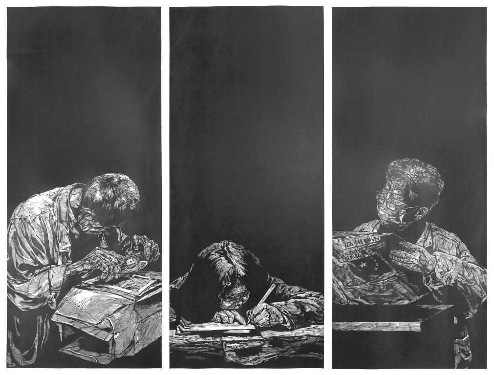作品解析:灵感来自于作者在小巷子看见的一位老人,他当时就坐在石阶上,非常专注的拿放大镜看报纸,在城市喧嚣的角落,老人另有一片天地,作者感动之余便在街头巷尾寻找到城市中读书的人,把他们组合起来,用一种简洁的形式刻了出来,主要想表达在浮躁的大数据时代下,人们仍需要找到自己的那一个灵魂自由的世界。